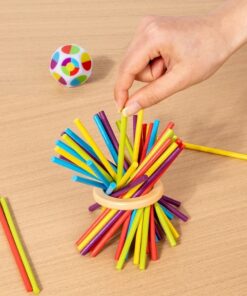 Joc de echilibru cu bețe și bile – extrage bețele colorate fără a lăsa bilele să cadă.