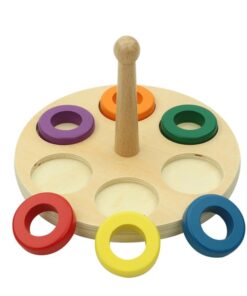 Copilul poate identifica și potrivi inelele în spațiile dedicate de pe bază, exersând recunoașterea culorilor și dezvoltând gândirea logică.