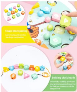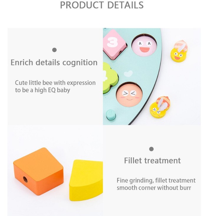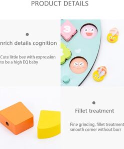 Materialele sunt realizate din lemn de calitate, vopsite cu culori non-toxice, sigure pentru copii. Designul prietenos și colorat stimulează interesul și menține atenția celor mici.