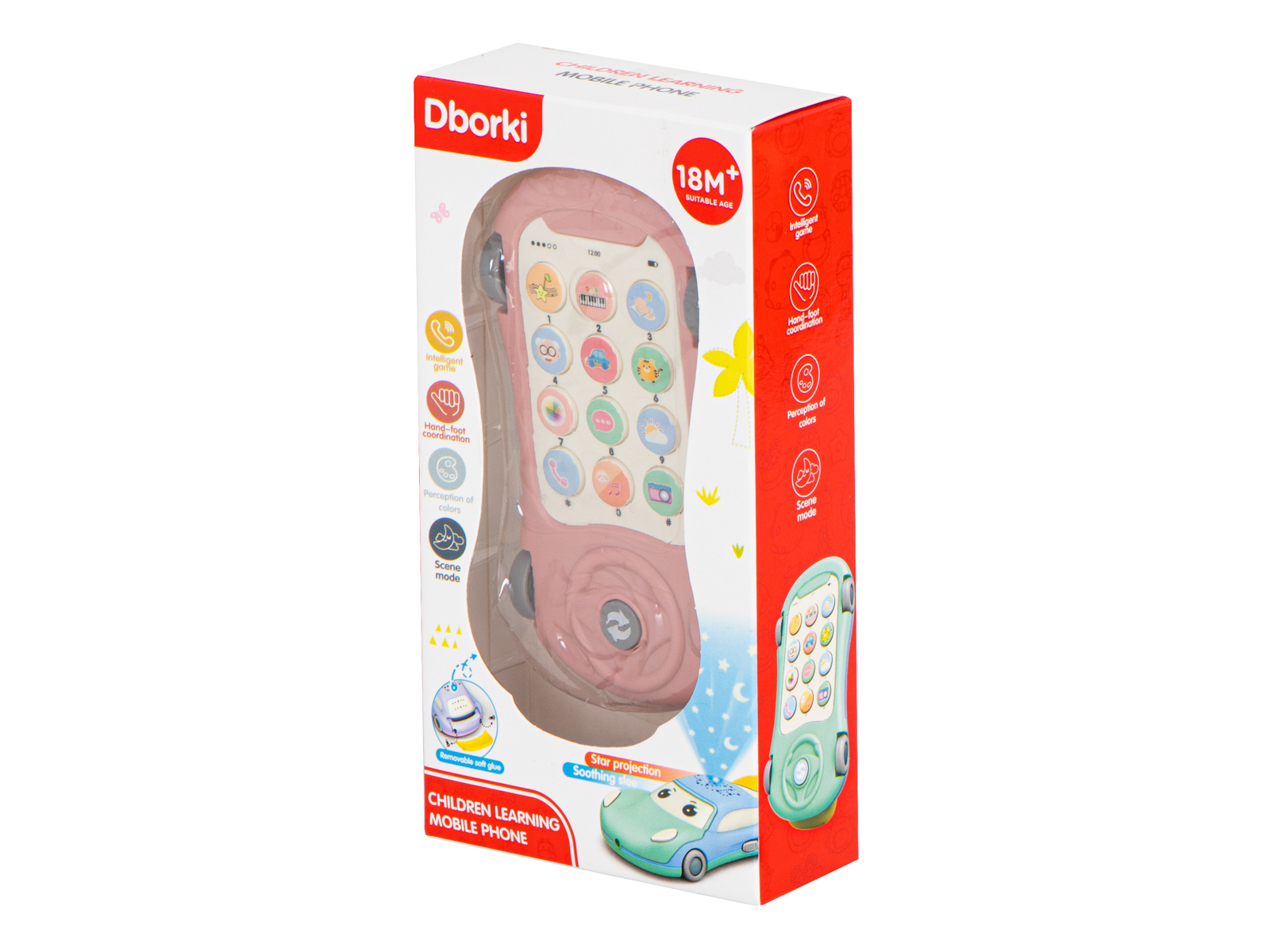 Aceasta nu este doar o jucărie excelentă, este și primul profesor de engleză! Telefonul învață numele culorilor, animalelor sau membrii familiei. Veți activa telefonul prin comutatorul de pe partea laterală a jucăriei.
