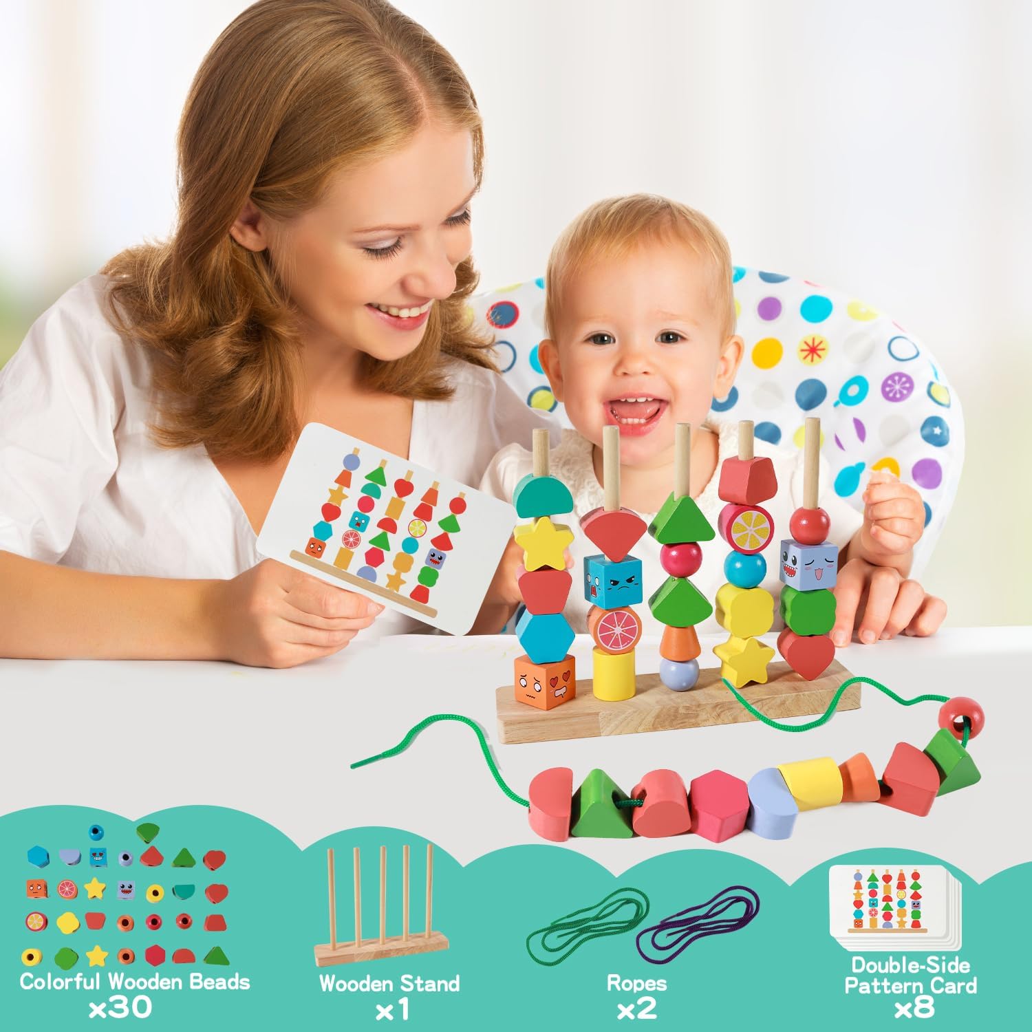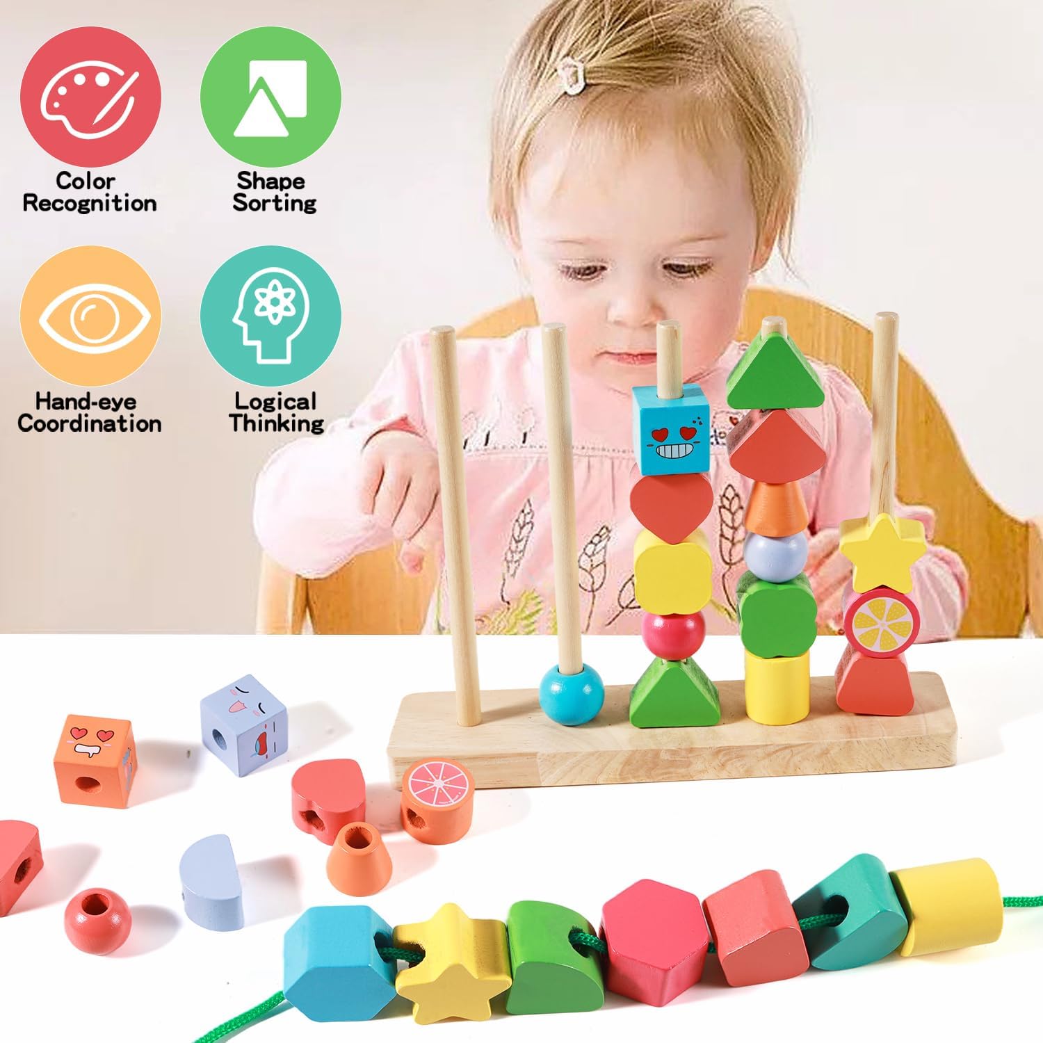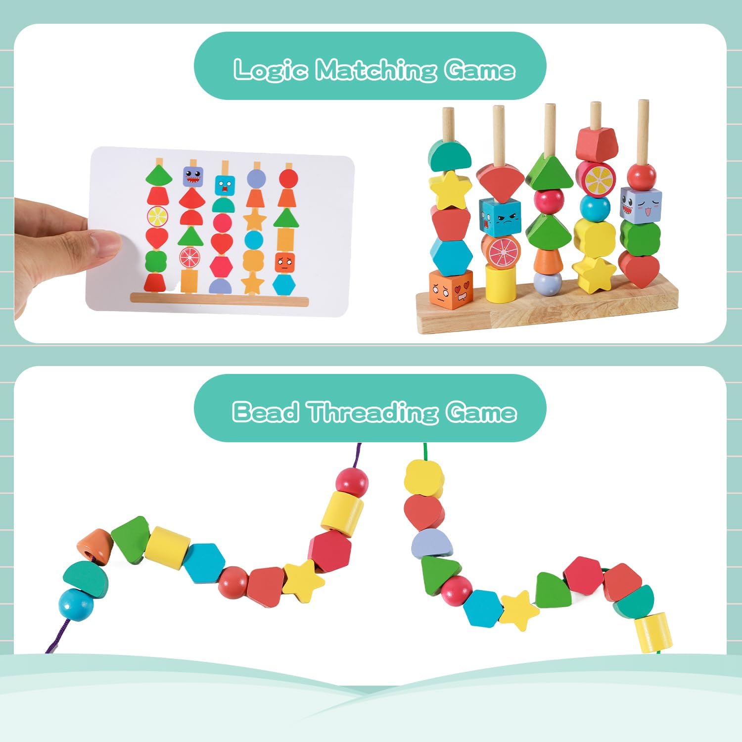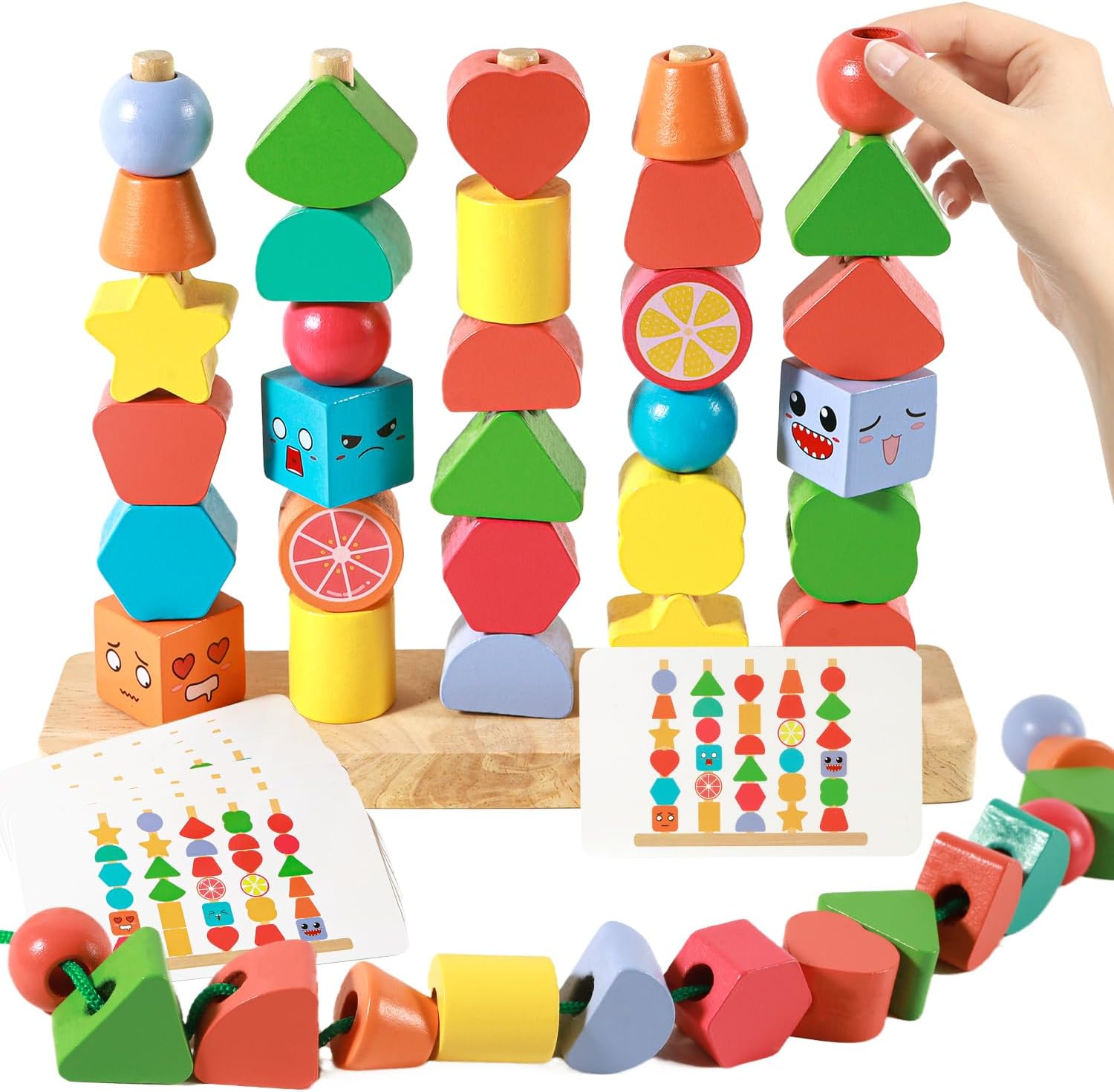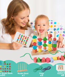 Joc de înșiruire: cu ajutorul șiretului, copilul poate introduce piesele pe fir, exersând motricitatea fină și răbdarea.