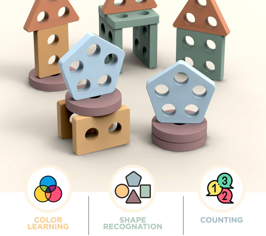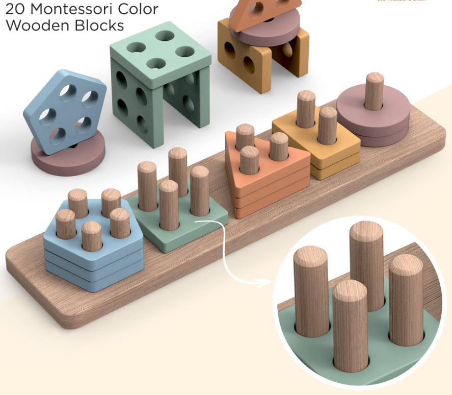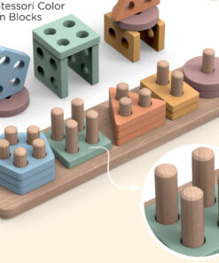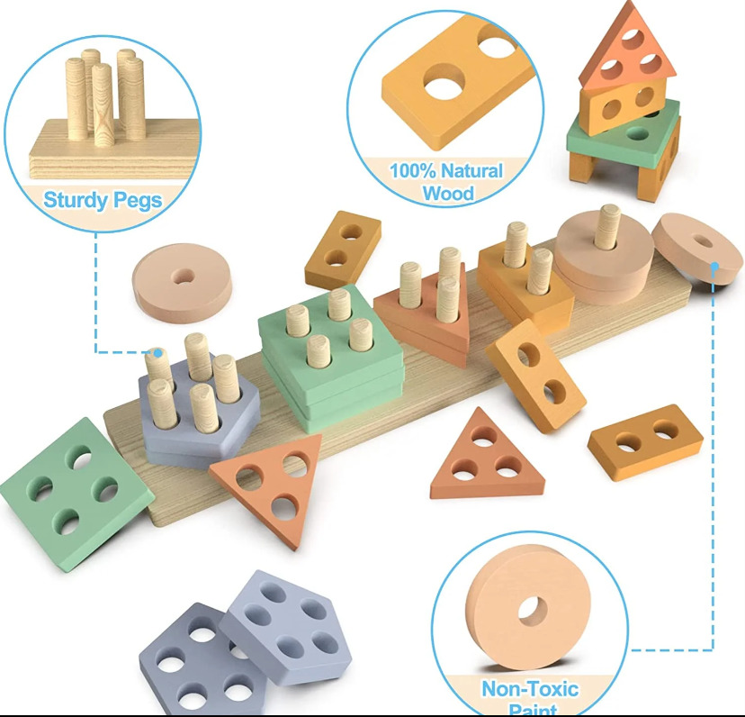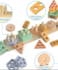 Sortatorul este format dintr-un suport si 20 piese din lemn, de dimensiuni mari, sub diferite culori pastelate si forme geometrice. Identificarea culorilor si potrivirea formelor geometrice poate fi o adevarata provocare pentru un copil.