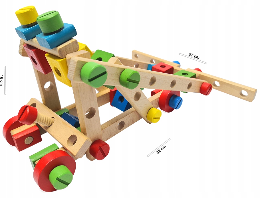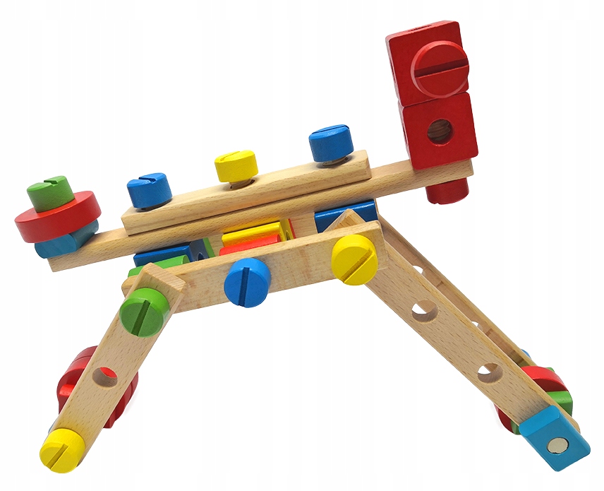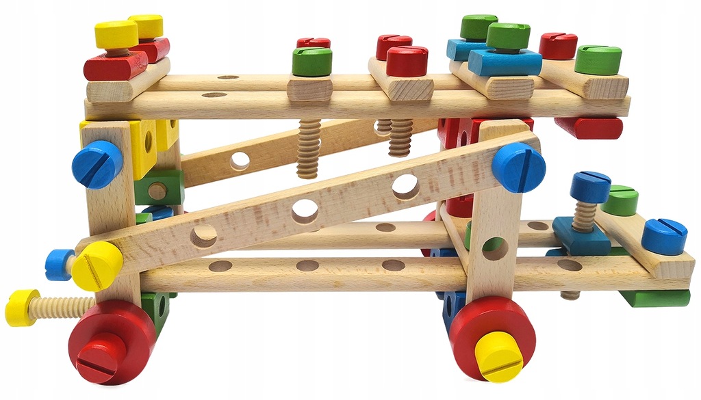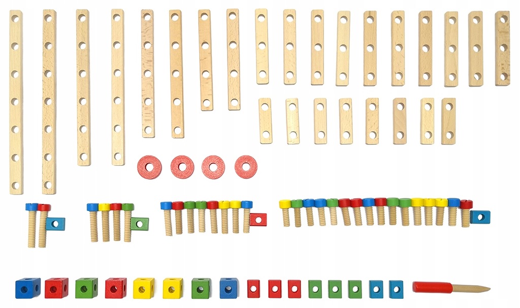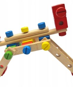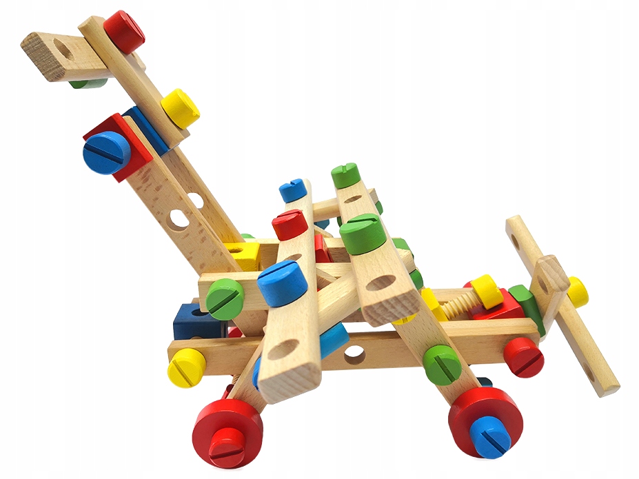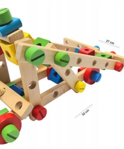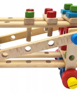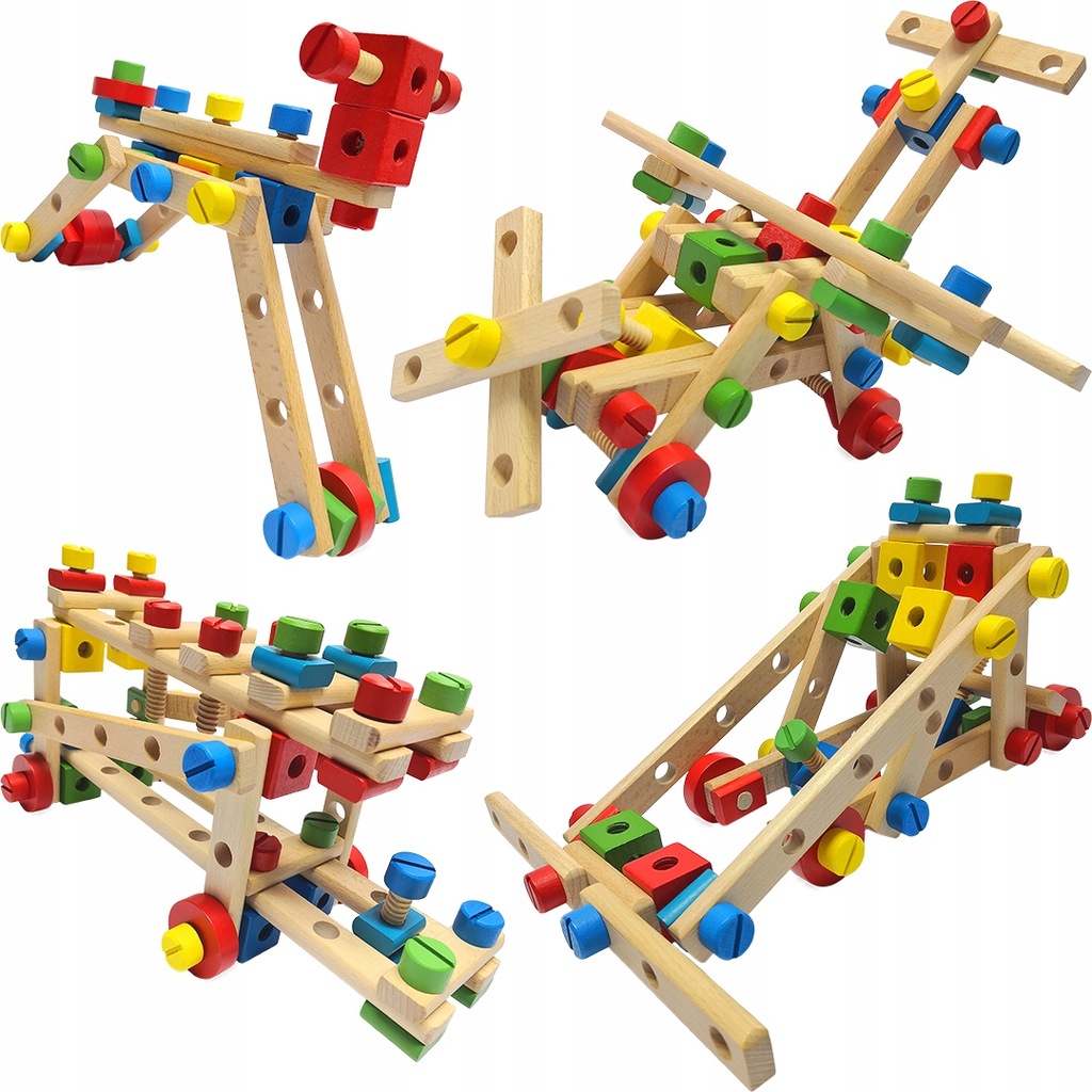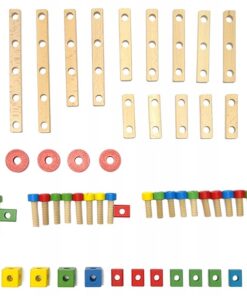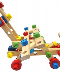 Copiii pot învăța cum să îmbine piese folosind șuruburi și piulițe, construind diverse forme: avioane, vehicule, roboți, animale sau structuri creative. Setul include bare perforate, cuburi, șuruburi, piulițe și roți din lemn, precum și o șurubelniță adaptată dimensiunii mâinilor celor mici.