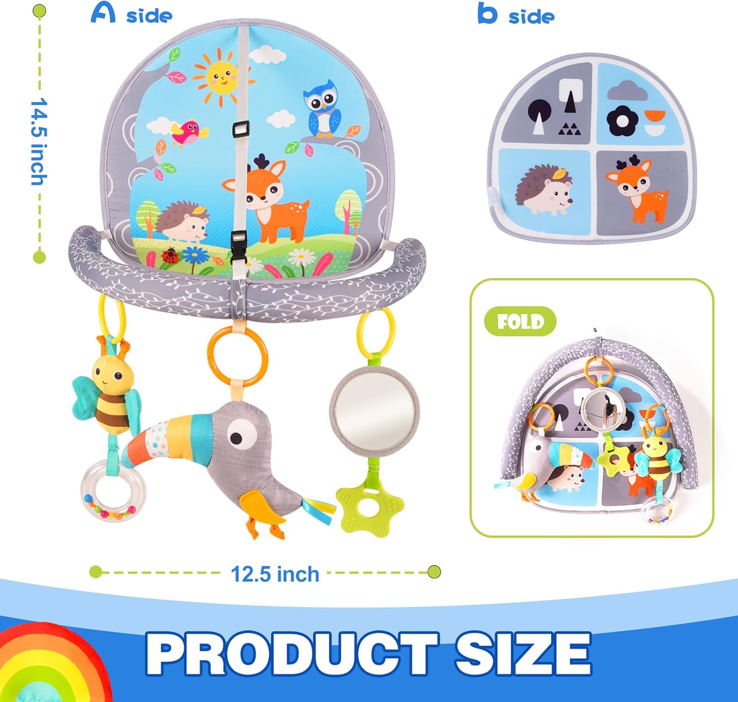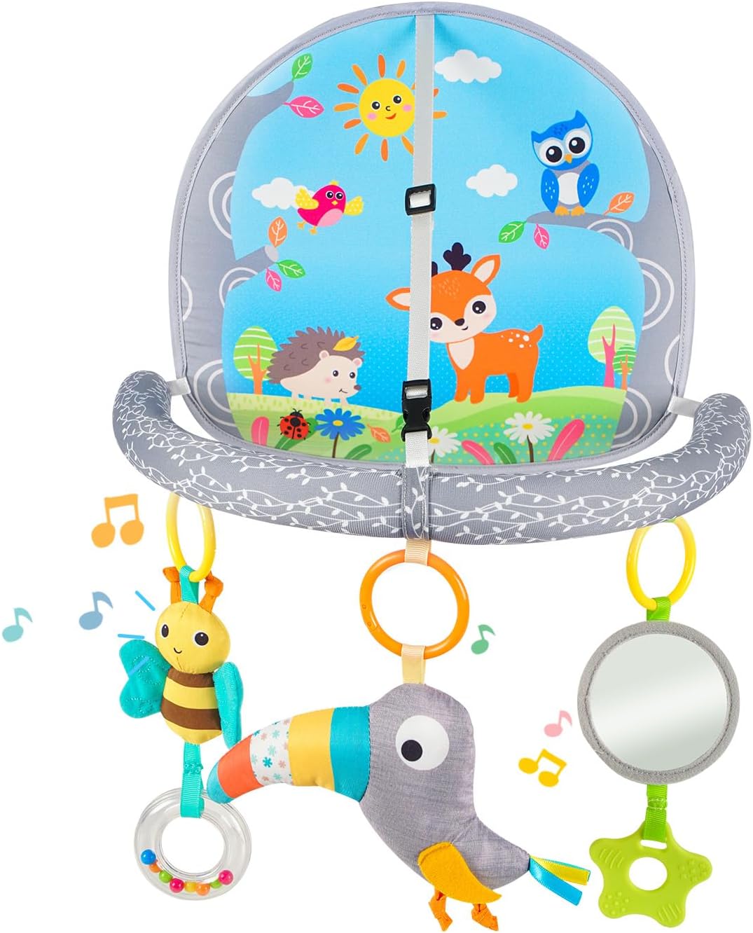🚗 În mașină: Se montează pe spătarul scaunului din față, astfel încât bebelușul să poată explora și interacționa cu jucăriile suspendate.