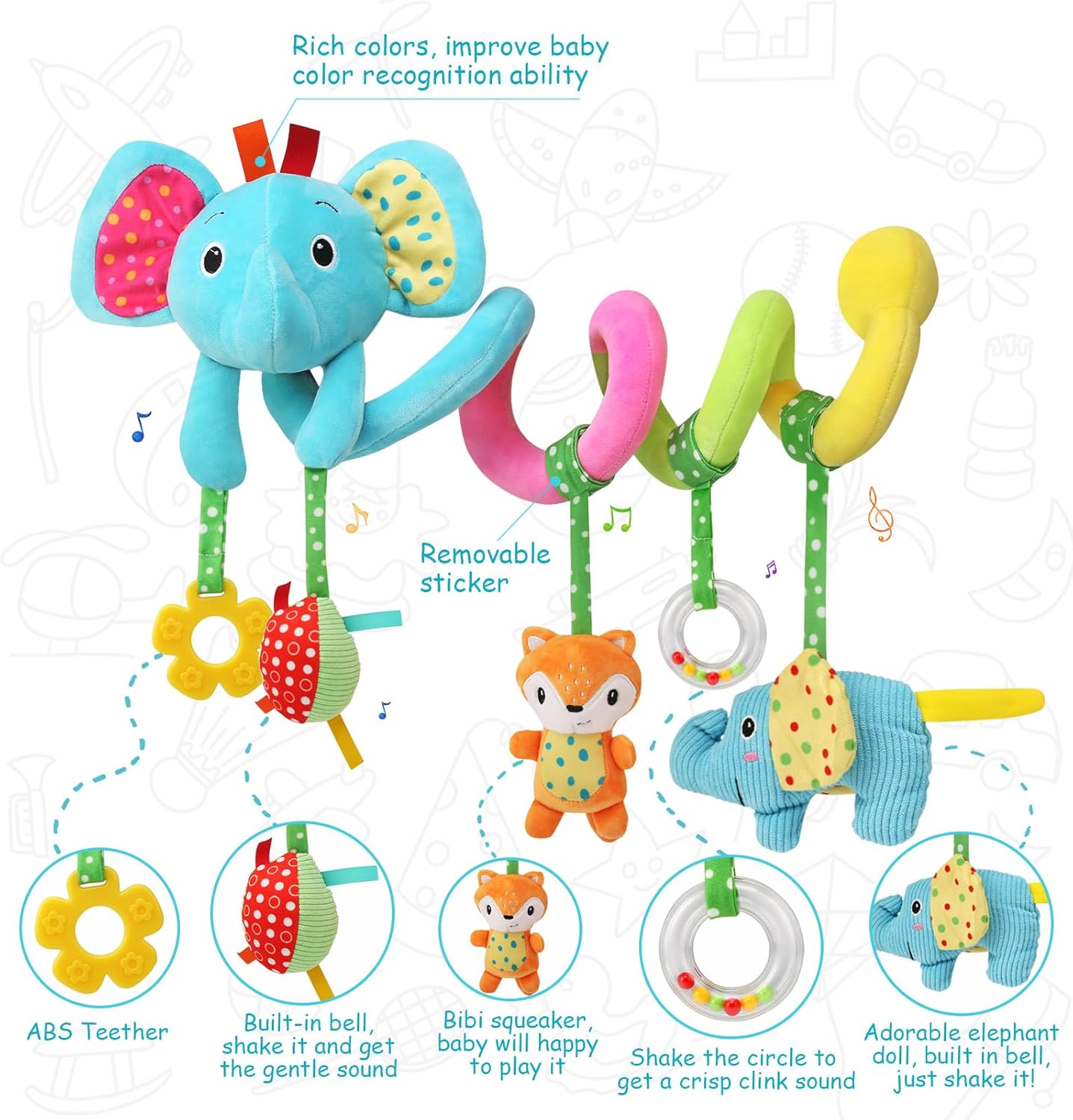 Această jucărie adorabilă în formă de elefant este proiectată pentru a stimula dezvoltarea senzorială și motrică a bebelușilor încă de la naștere. Ideală pentru utilizare în patul sau căruciorul copilului, această jucărie multifuncțională oferă multiple beneficii: