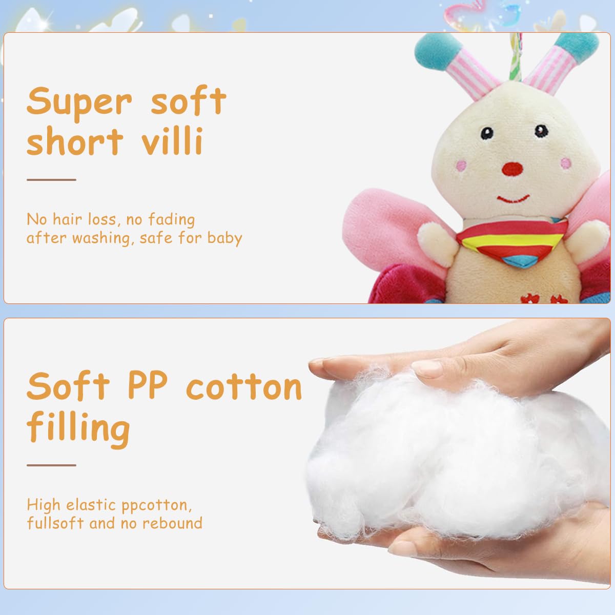 - Materiale de înaltă calitate: Fluturașul este realizat dintr-un pluș foarte moale și catifelat, care nu își pierde forma după spălare și nu lasă scame. Umplutura este din bumbac PP elastic și non-toxic, asigurând o textură plăcută la atingere și sigură pentru bebeluși.