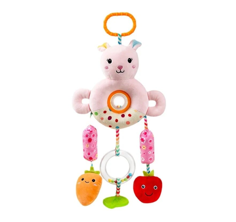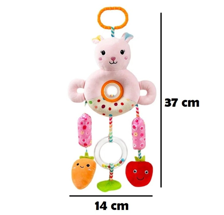 Această jucărie adorabilă în formă de iepuras este proiectată pentru a stimula dezvoltarea senzorială și motrică a bebelușilor. Ideală pentru utilizare în patul sau căruciorul copilului, această jucărie multifuncțională oferă multiple beneficii: