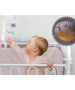 Caruselul muzical cu telecomandă este o jucărie ideală pentru nou-născuți, concepută pentru a liniști bebelușul și a-i stimula simțurile prin muzică, mișcare și lumini proiectate. Cu un design elegant în nuanțe pastel de roz, caruselul se montează ușor pe pătuț și oferă o atmosferă calmă și plăcută pentru somnul micuțului.
