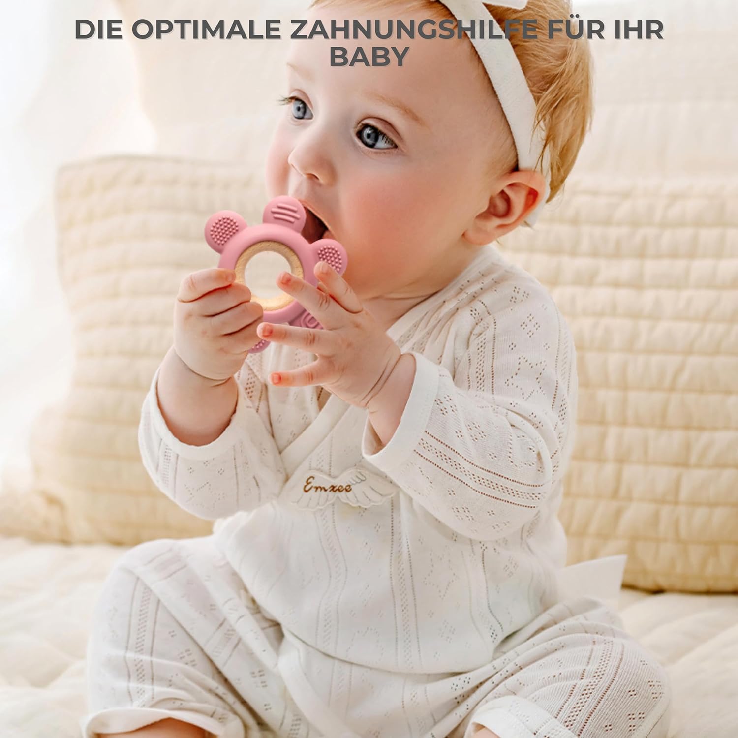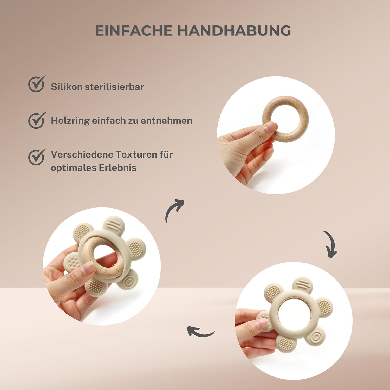 ✔️ Materiale sigure – Fabricată din silicon alimentar de înaltă calitate, fără BPA, și lemn de fag netratat, potrivit pentru contactul cu gura bebelușului.