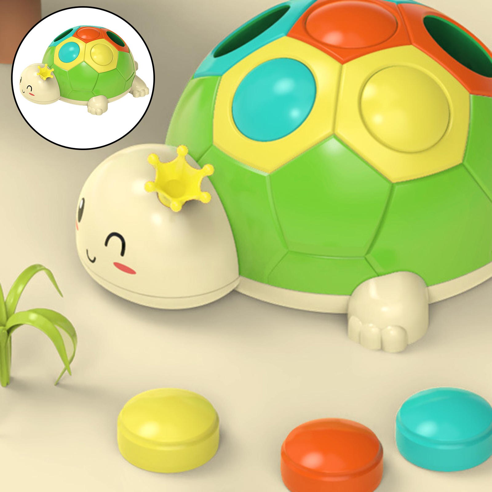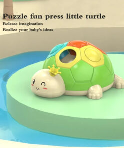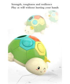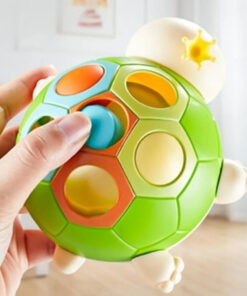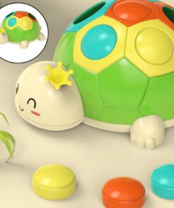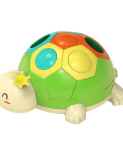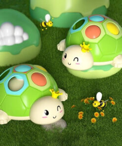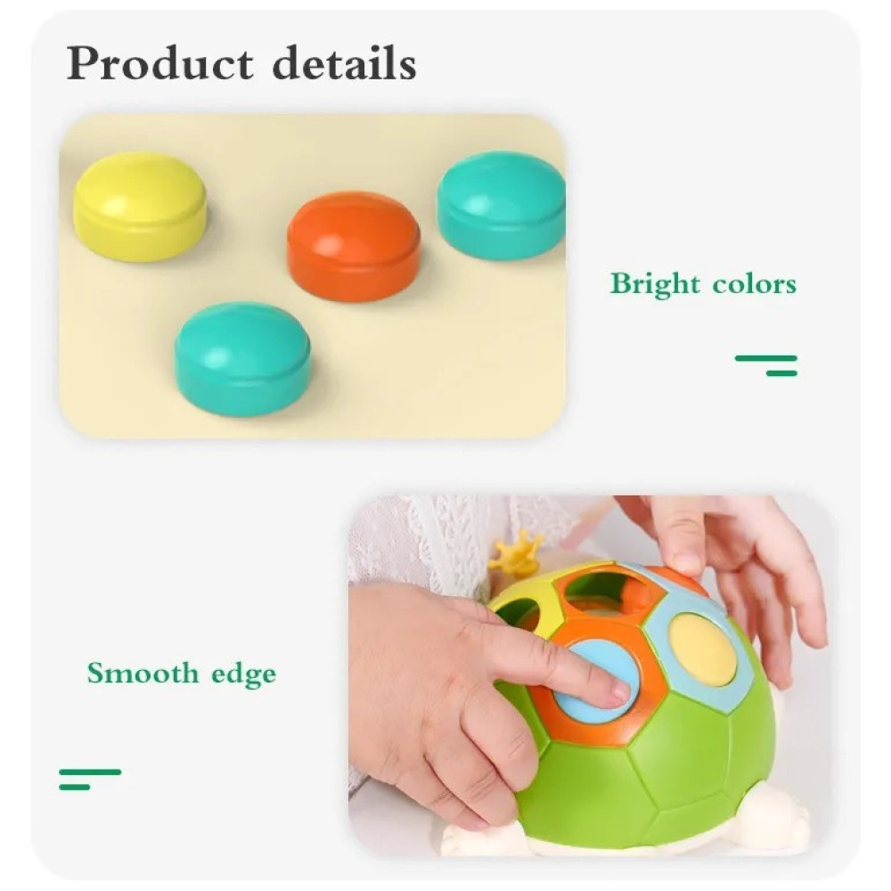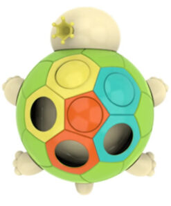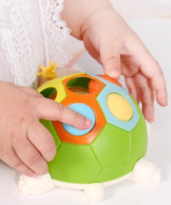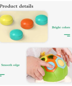 - exersam motricitatea – Broscuta are o carapace cu sase orificii in trei culori, iar in interior se afla trei butoane colorate in turcoaz, portocaliu si galben pe care copiii le pot plimba si asocia cu culorile de pe carapace