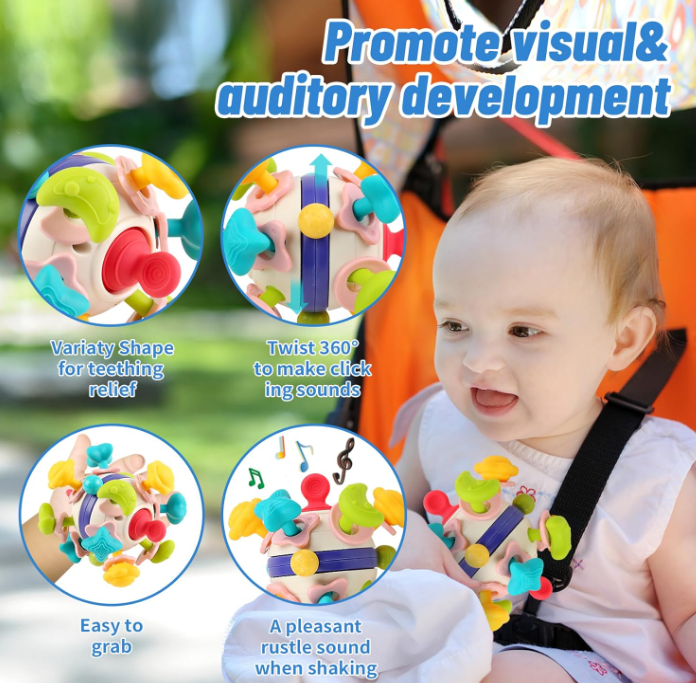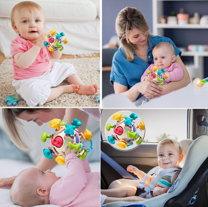 Această jucărie senzorială multifuncțională este perfectă pentru a fi utilizată în orice moment al zilei, fie pentru joacă, fie pentru confortul în perioadele de creștere a dințișorilor, oferindu-le bebelușilor o experiență plăcută și sigură.