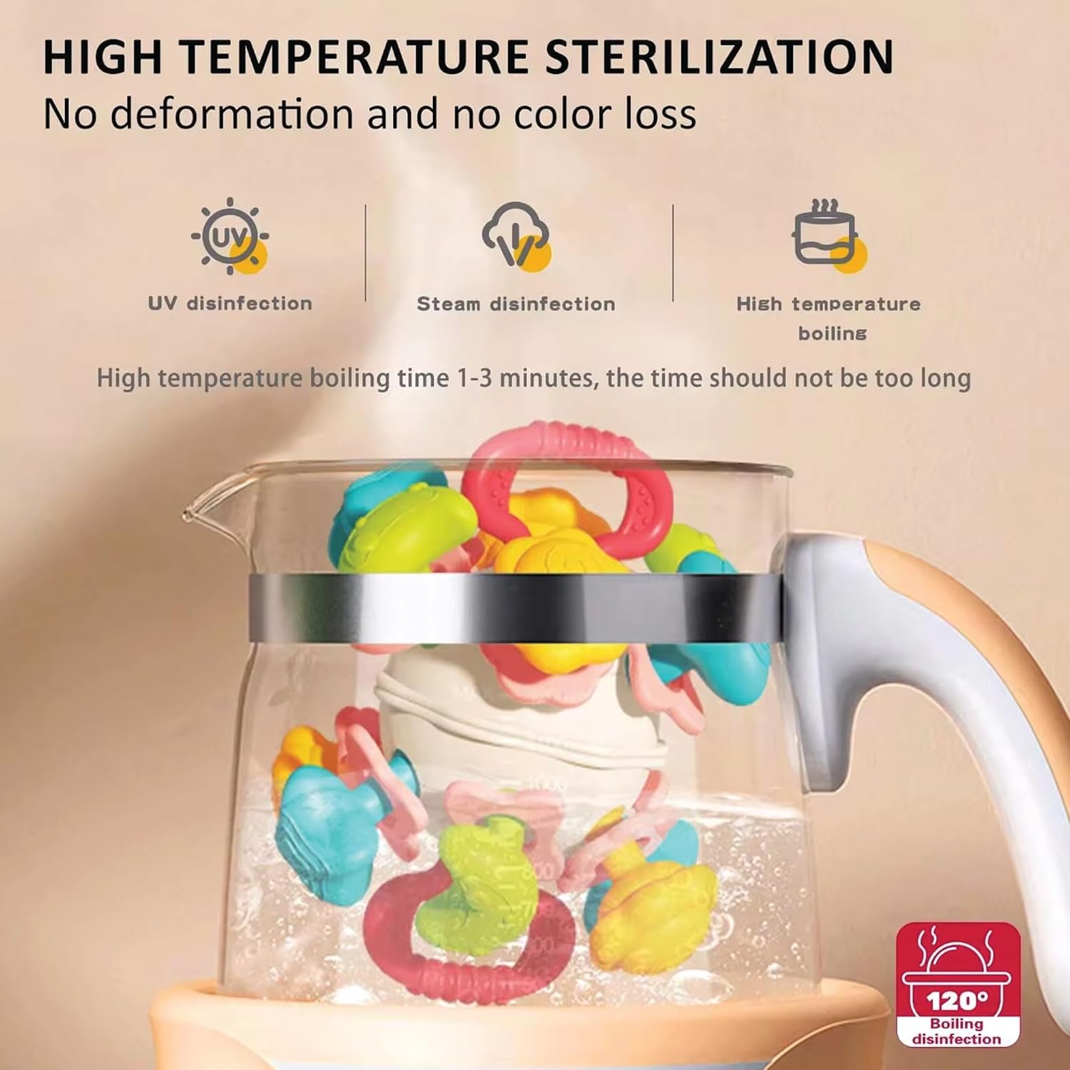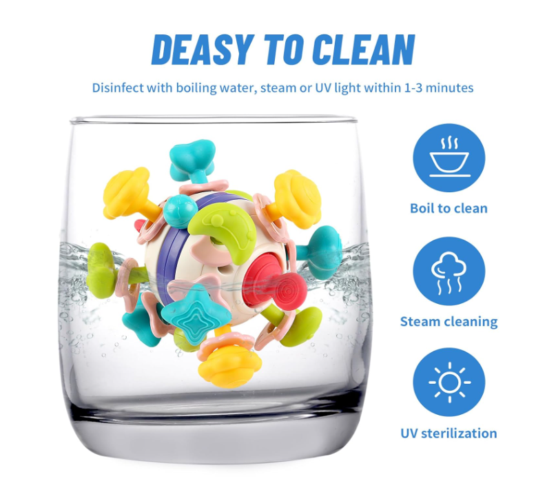 - Sterilizare la temperatură înaltă: Jucăria poate fi sterilizată prin fierbere timp de 1-3 minute, fără să își piardă culoarea sau să se deformeze, oferind astfel un plus de siguranță.