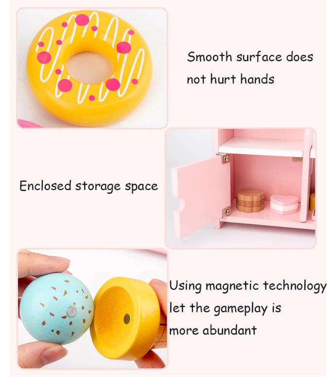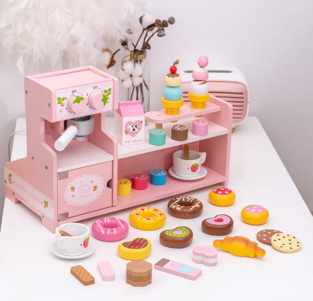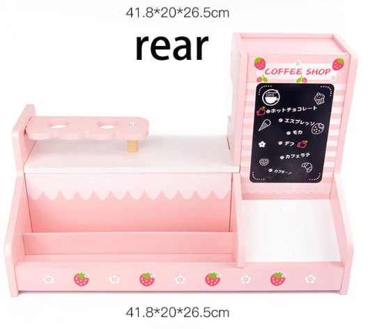 Acest set de jucării din lemn, denumit „Mini Stand de Dulciuri și Cafea”, este special creat pentru copiii cu vârsta de 3 ani și peste. Setul imită un stand de cafea și dulciuri, oferind copiilor oportunitatea de a se juca într-un mod creativ și educativ, simulând activitățile dintr-o cafenea adevărată. Jucăria este construită din lemn de înaltă calitate, având un design atractiv și culori vii care captează atenția copiilor.