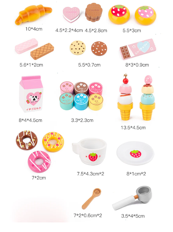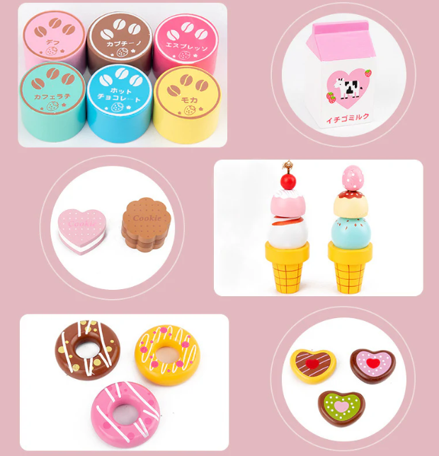 - Accesorii Diverse: Setul vine cu multiple accesorii care imită diverse dulciuri și băuturi, inclusiv prăjituri, gogoși, înghețată, capsule de cafea și cești. De asemenea, există o linguriță și un suport pentru capsulele de cafea.