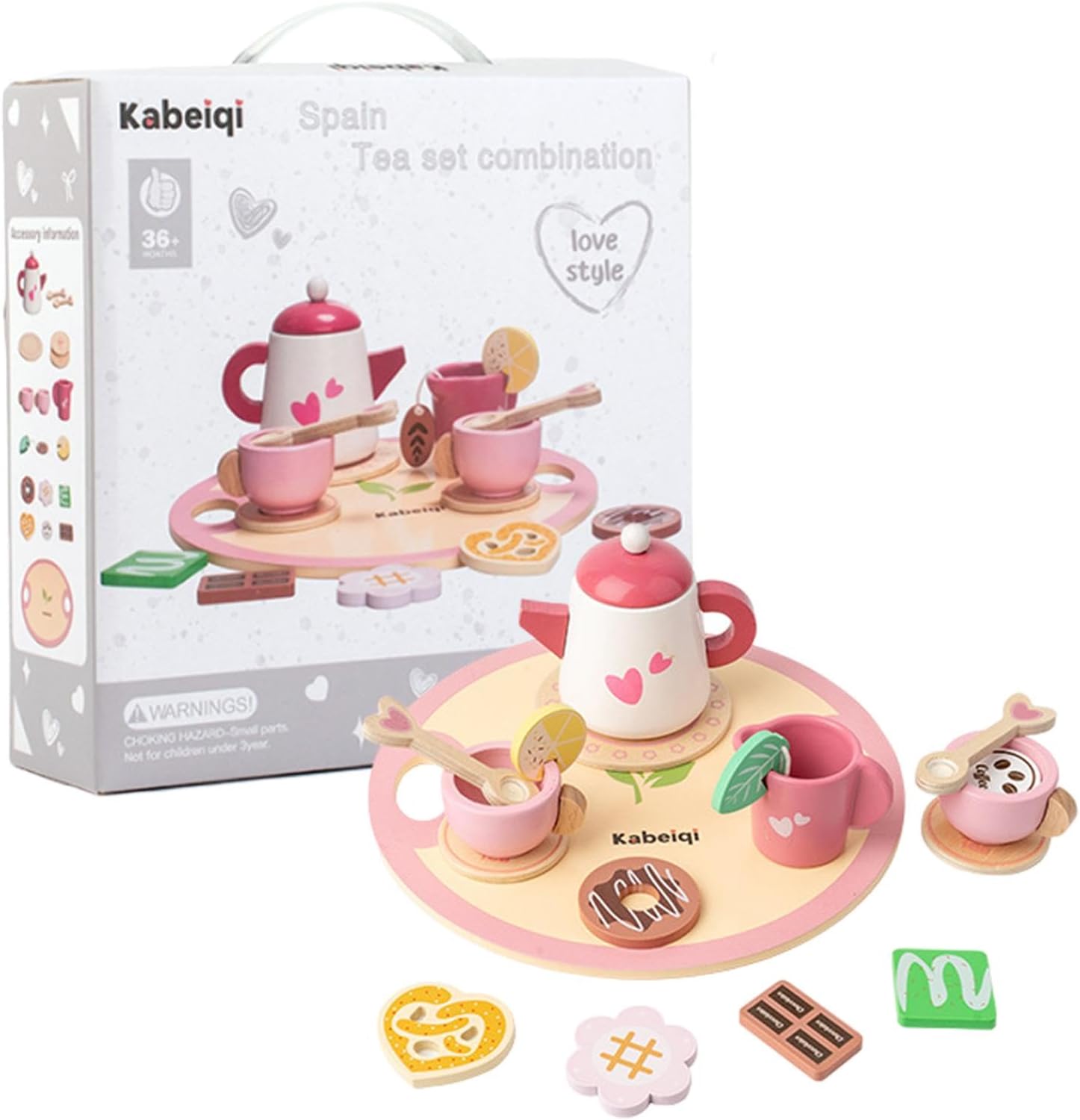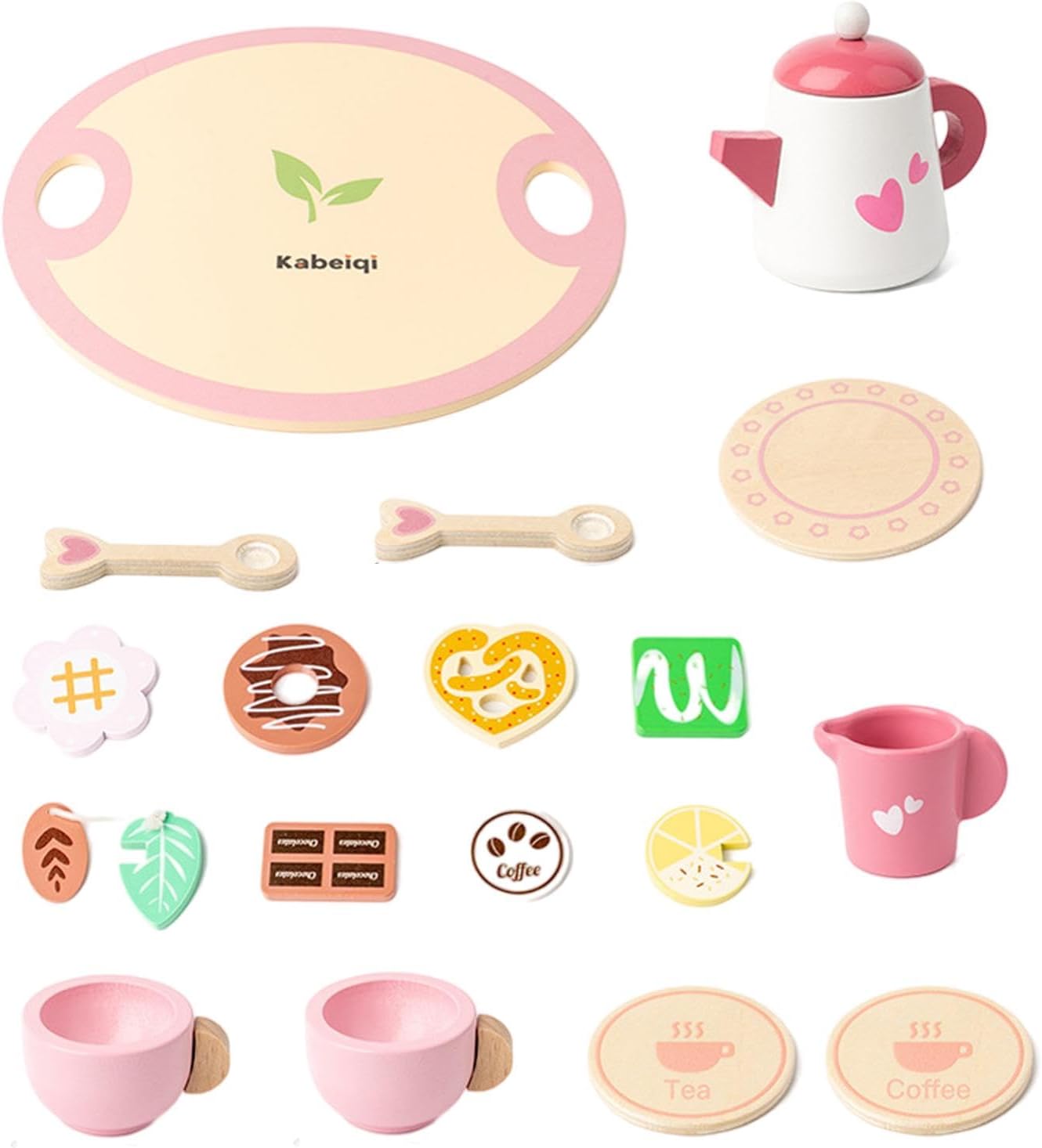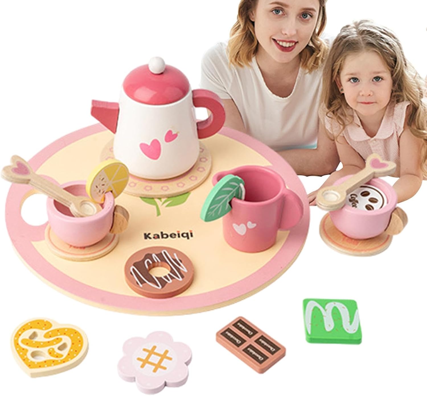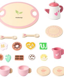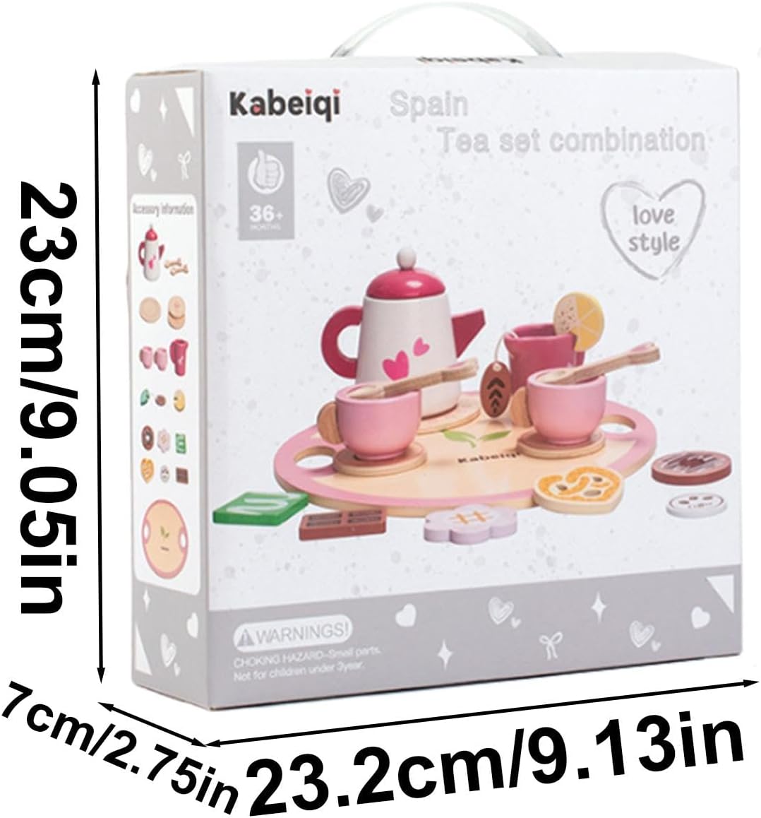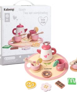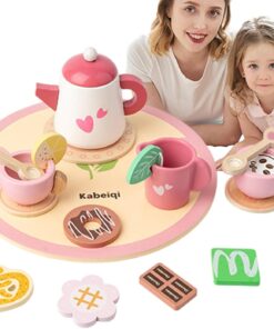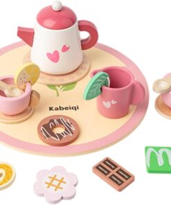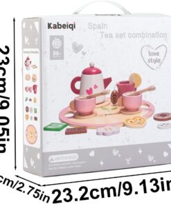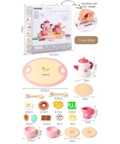 Realizat din lemn rezistent, cu finisaje fine și vopsele non-toxice, setul include farfurioare, ceainic, cești, lingurițe, prăjituri și un platou de servire, oferind o experiență realistă și educativă.