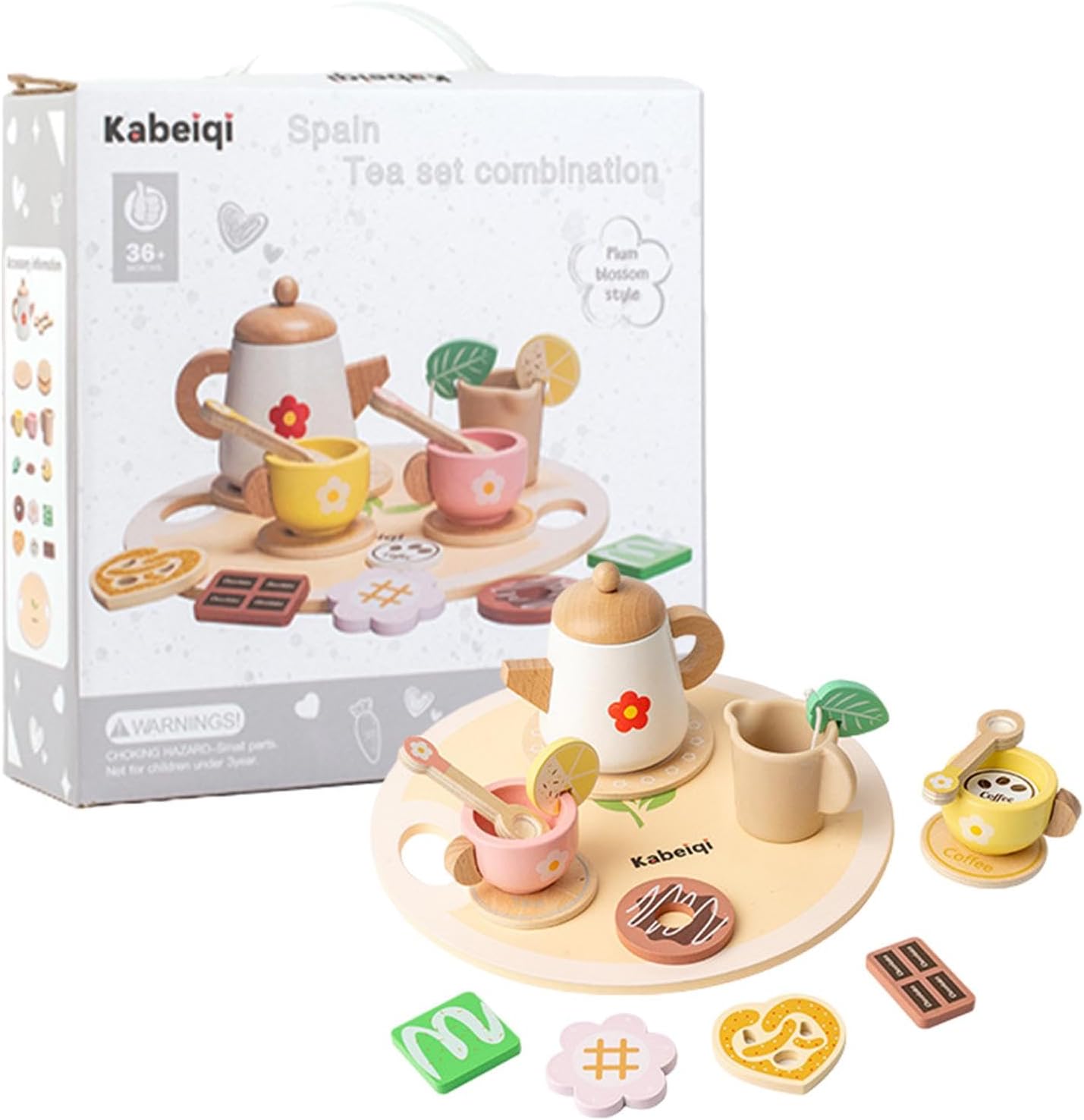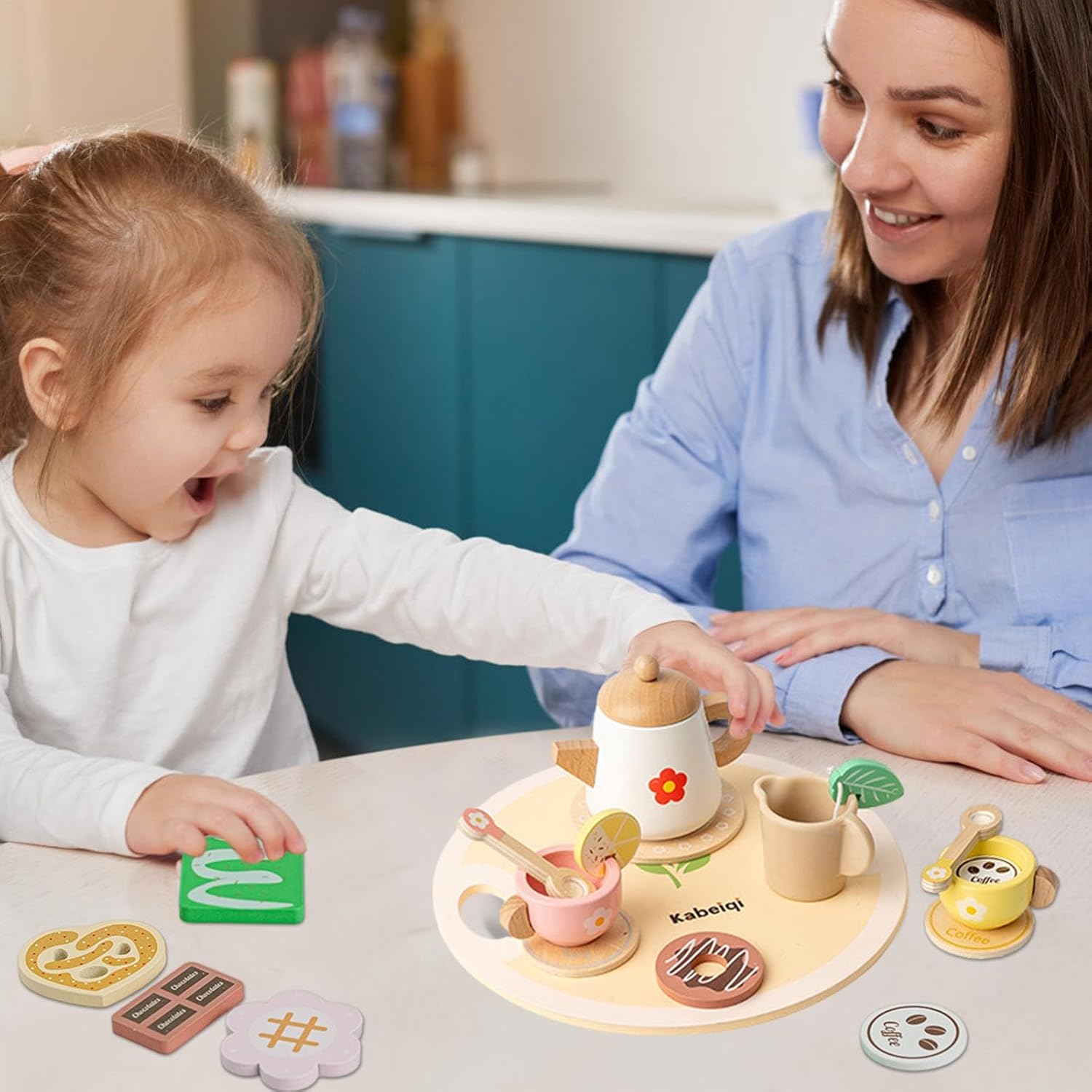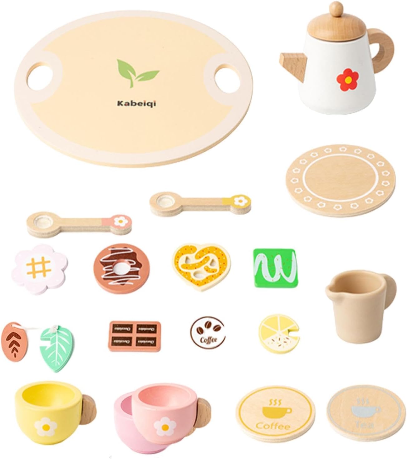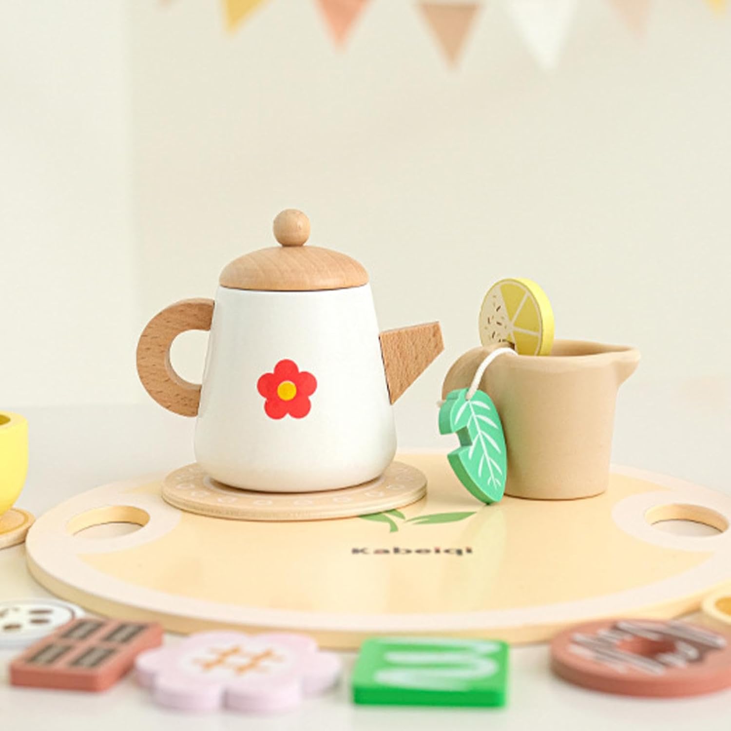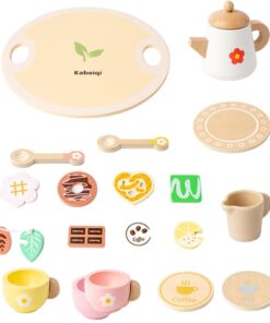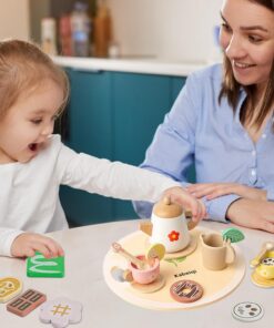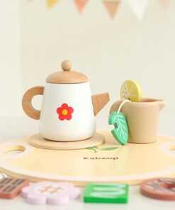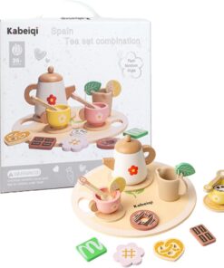 Realizat din lemn rezistent, cu finisaje fine și vopsele non-toxice, setul include farfurioare, ceainic, cești, lingurițe, prăjituri și un platou de servire, oferind o experiență realistă și educativă.