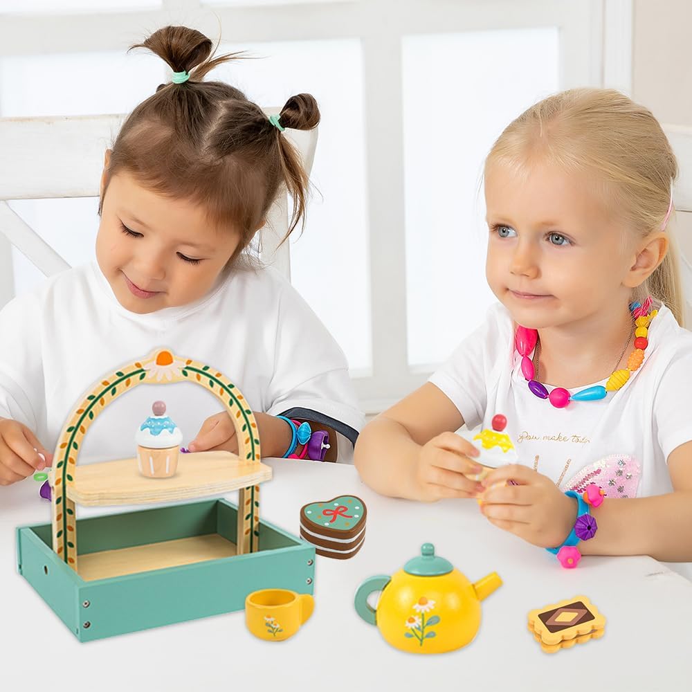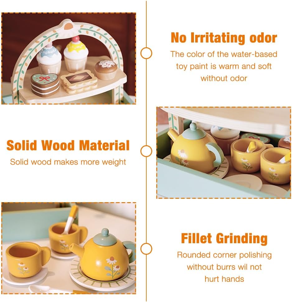 Setul de servire a ceaiului din lemn este o jucărie educativă de tip Montessori, concepută pentru a încuraja jocul de rol, imaginația și dezvoltarea abilităților sociale ale copiilor. Format din 14 piese din lemn atent finisate, acest set permite copiilor să organizeze propriile „petreceri de ceai”, stimulând creativitatea și învățarea prin joc.