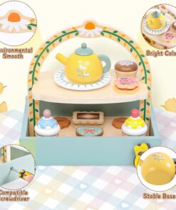 Setul include un suport pentru servirea deserturilor și ceaiului, cești, lingurițe, prăjituri și un ceainic decorat, toate organizate într-o structură practică ce poate fi utilizată și pentru depozitarea pieselor.