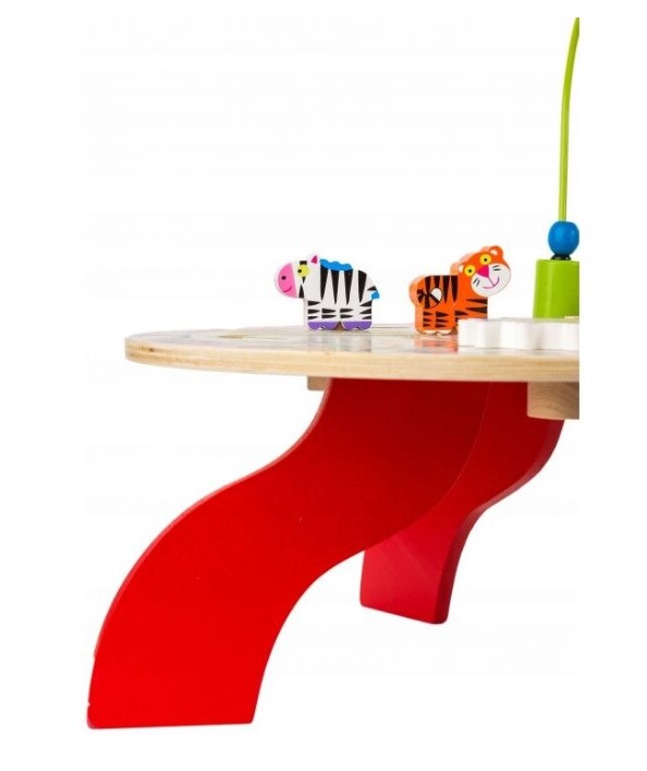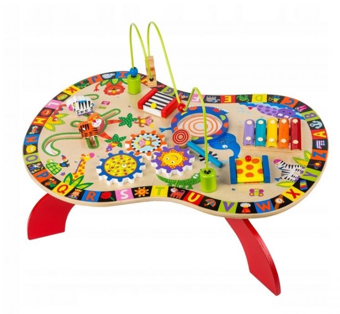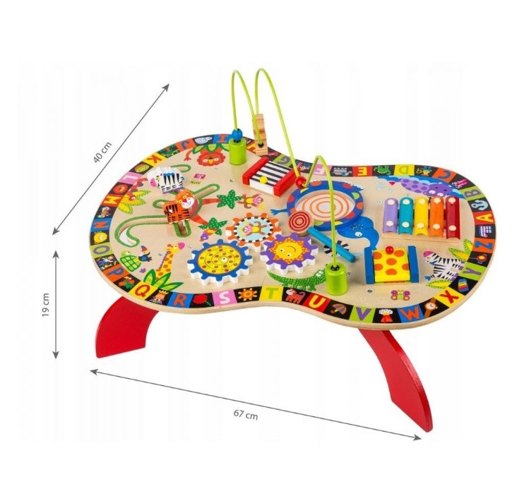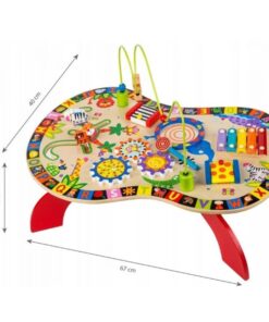Măsuța de activități este un centru educațional complex, realizat din lemn de calitate superioară, destinat stimulării dezvoltării cognitive și motorii fine a celor mici. Aceasta oferă o experiență multisenzorială, având multiple activități interactive integrate într-un design colorat și atractiv.