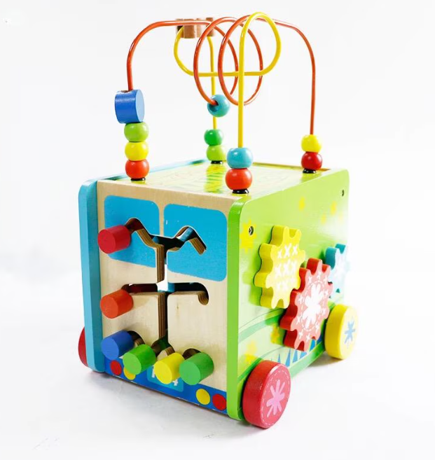 - Design Multifuncțional: Jucăria include mai multe activități educative pe fiecare latură a mașinuței. Acestea includ un sortator de forme geometrice, rotițe zimțate care se pot învârti, un labirint cu bile și alte elemente interactive care contribuie la dezvoltarea coordonării mână-ochi și a logicii.