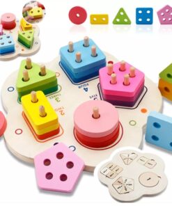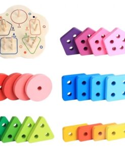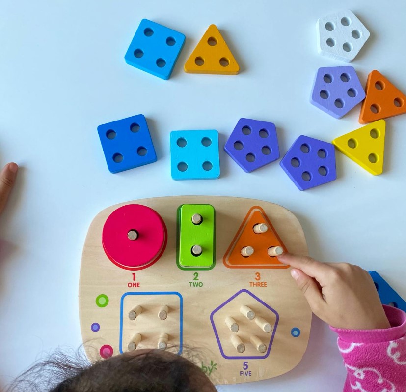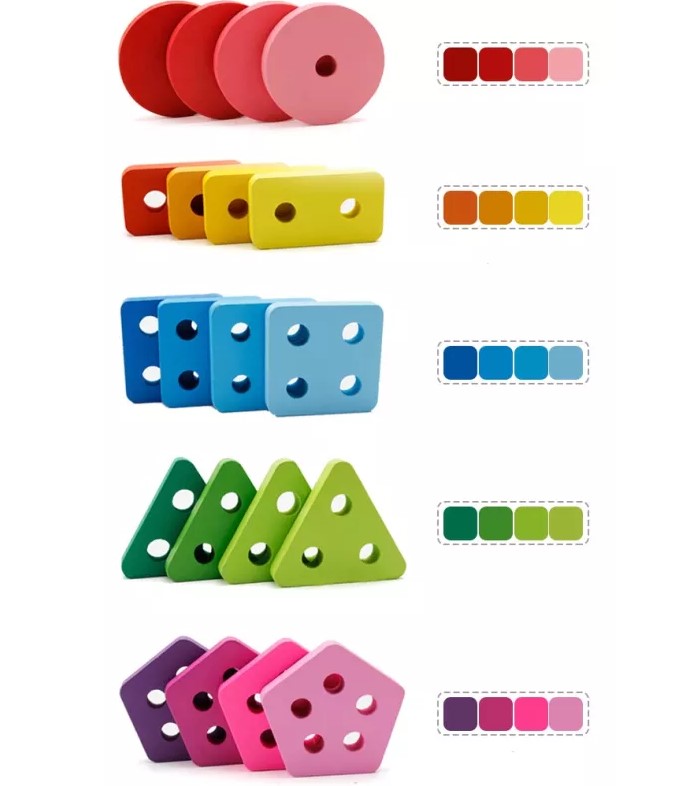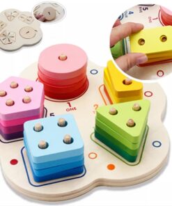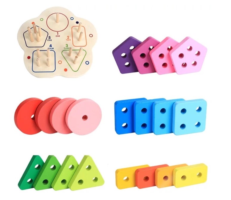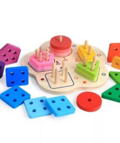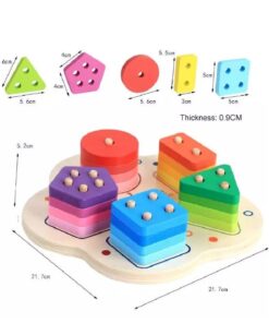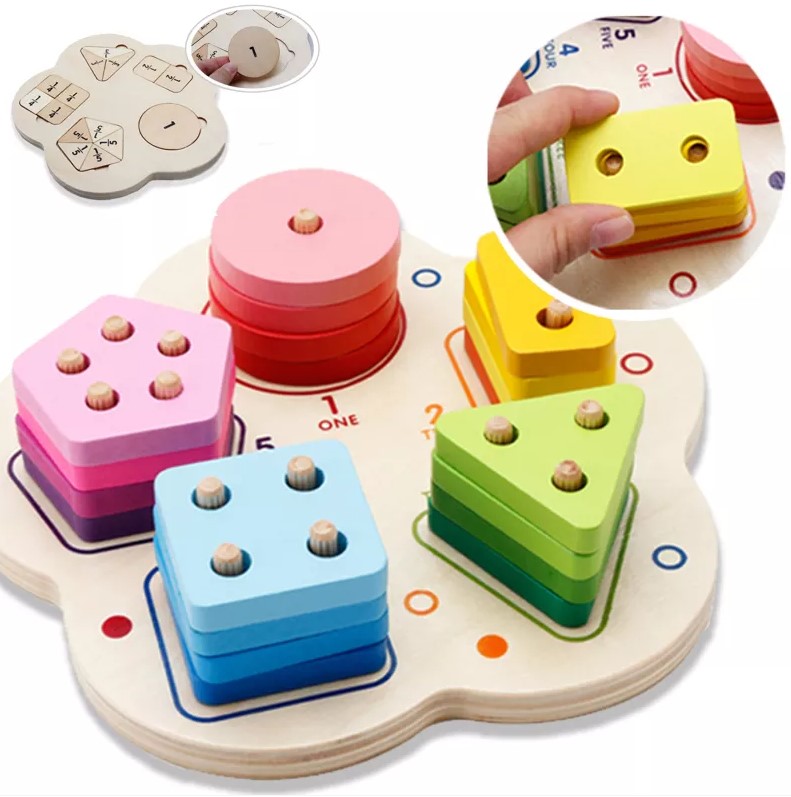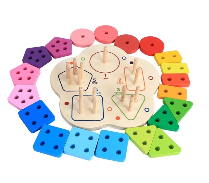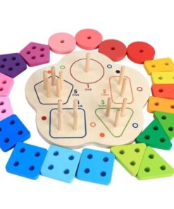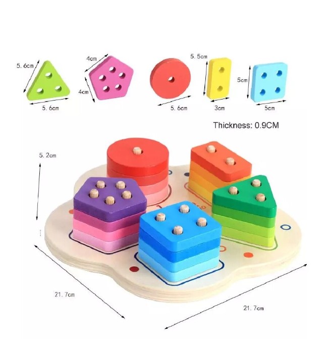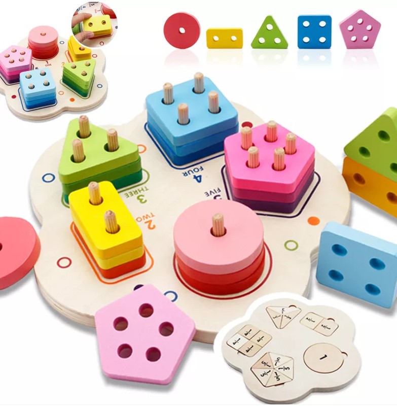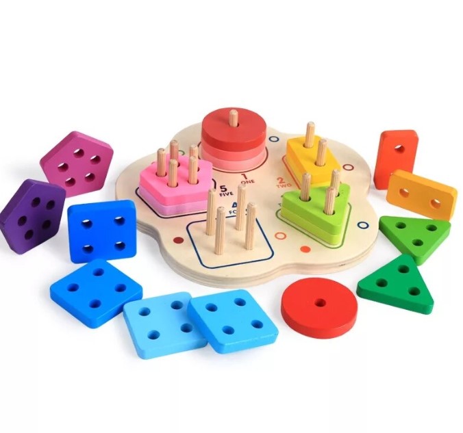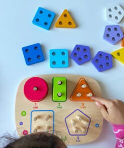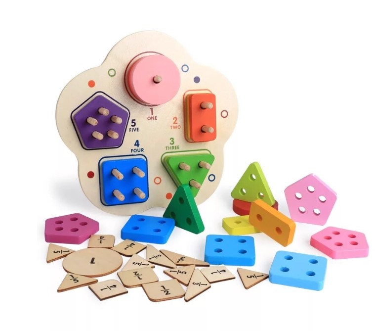 Această jucărie din lemn combină învățarea formelor geometrice cu recunoașterea numerelor și dezvoltarea abilităților motrice fine. Sortatorul este format dintr-o bază rotunjită, care conține cinci tipuri de forme colorate (cerc, pătrat, triunghi, dreptunghi, pentagon), fiecare cu un număr diferit de găuri și de pioni de fixare, pentru a ajuta copiii să învețe numerele prin manipulare.