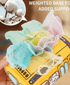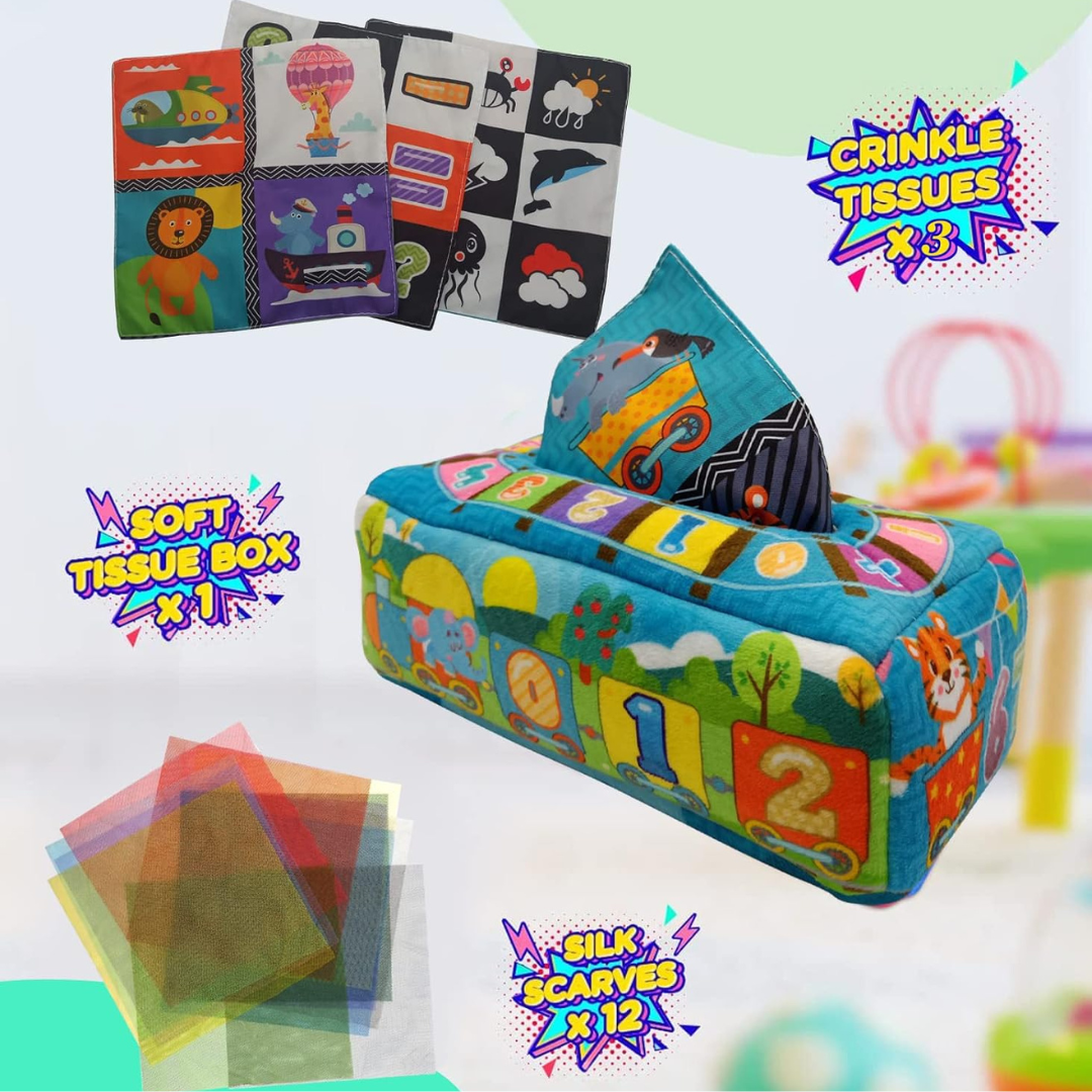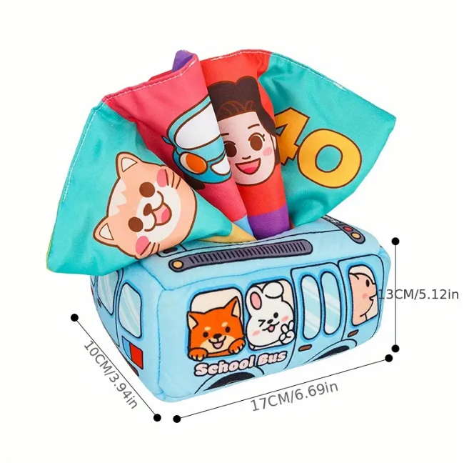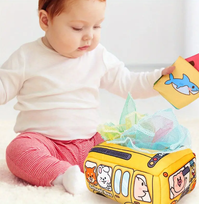 Cu texturi variate si sunete fascinante, Cutia cu batiste incurajeaza explorarea tactila si auditiva. Dezvolta coordonarea mana-ochi si ajuta la intelegerea cauza-efect.