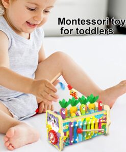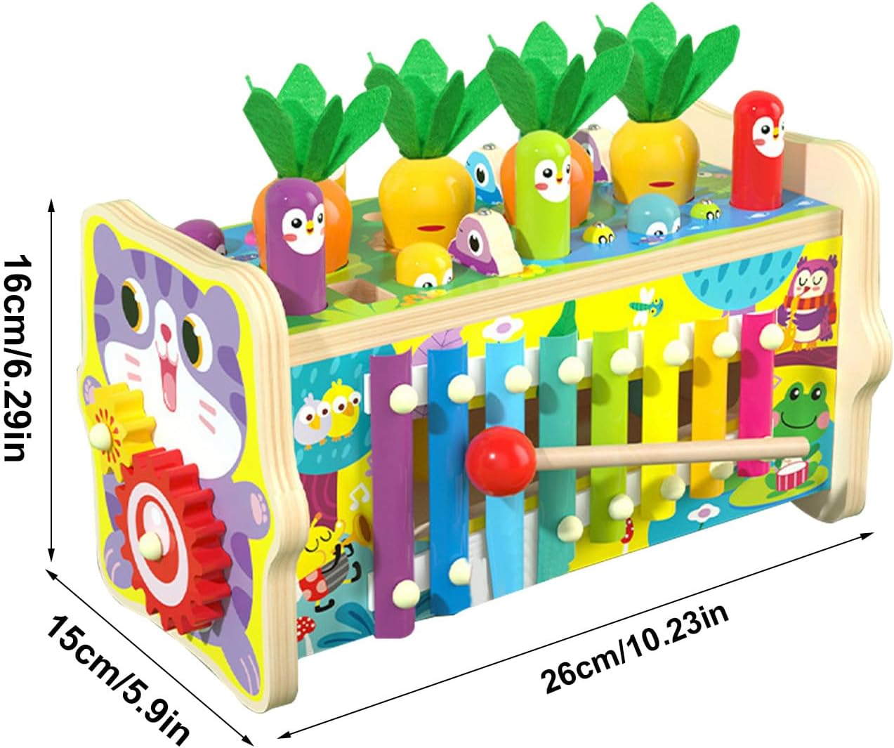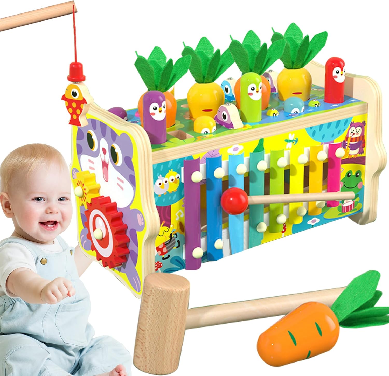 - 8 activități educative într-un singur produs – Include pescuit magnetic, recoltare de morcovi, xilofon muzical, joc de potrivire a formelor, roți dințate, ciocan de bătut, sortator de culori și activitate de prindere a insectelor.