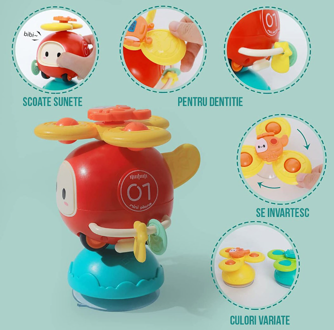 - spinner cu ventuza pentru lipire pe orice suprafata neteda (carucior, masa, scaun inalt, cada, podea,etc),