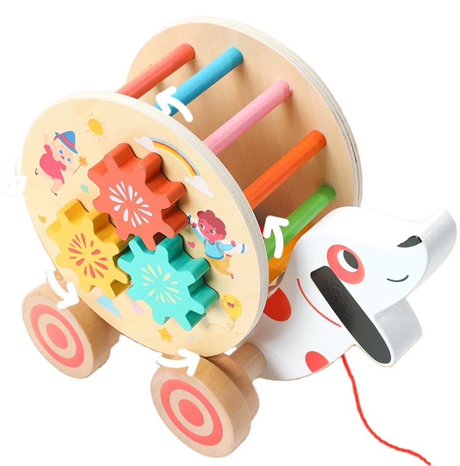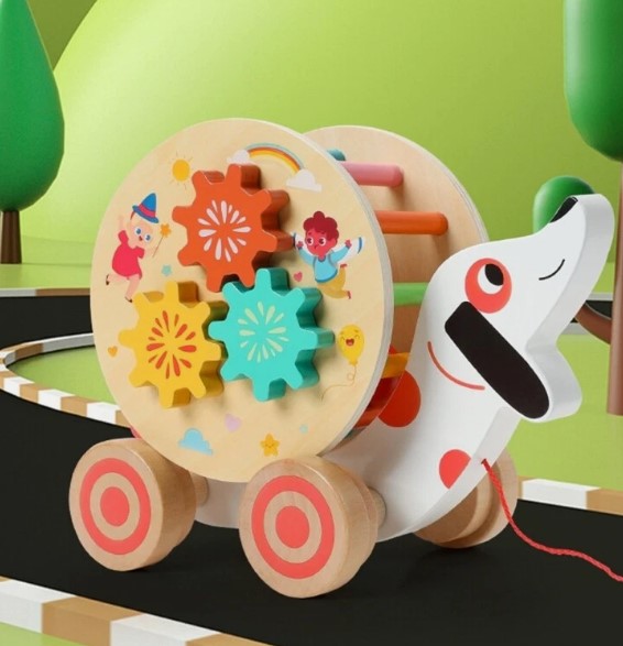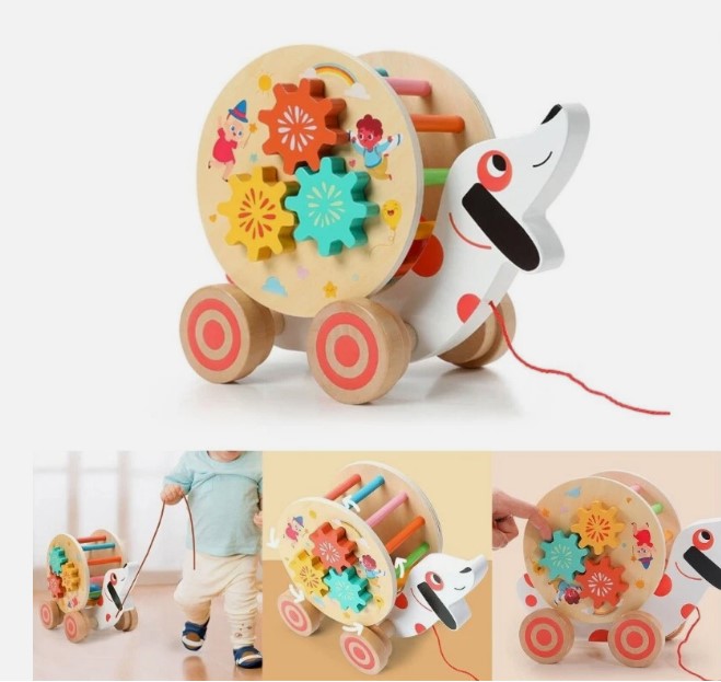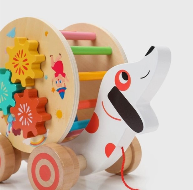 Include: jucărie în formă de cățel cu roți, ceas didactic, roți zimțate, labirint cu biluțe și șnur pentru tras