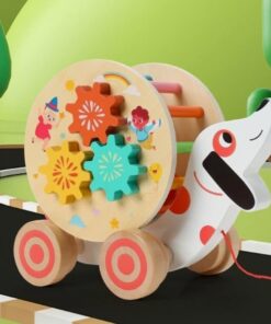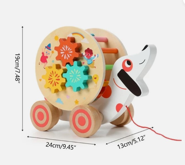 Această jucărie interactivă din lemn, în formă de cățel vesel, este o alegere excelentă pentru copiii de la 18 luni. Concepută pentru a fi trasă cu șnur, jucăria stimulează mișcarea și coordonarea, iar activitățile educative integrate pe fiecare parte o transformă într-un centru de învățare mobil.