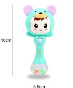 Urechile moi din silicon funcționează ca jucărie de dentiție, ideale pentru calmarea gingiilor în perioada erupției dentare, iar capul jucăriei luminează plăcut în mai multe culori. Muzica blândă și sunetele vesele stimulează auzul și atenția copilului, în timp ce bilele colorate din mâner produc sunete de zornăit care atrag interesul bebelușului.