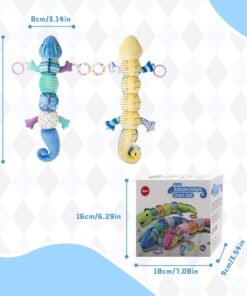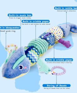 - Elemente senzoriale variate: Fiecare segment al omiduței ascunde surprize – clopoței în interior care zornăie și scot clinchete ușoare la mișcare, precum și materiale foșnitoare (pânză care foșnește) – stimulând auzul și simțul tactil al copilului. Texturile diferite ale plușului (neted, reliefat) invită bebelușul să atingă și să descopere.
