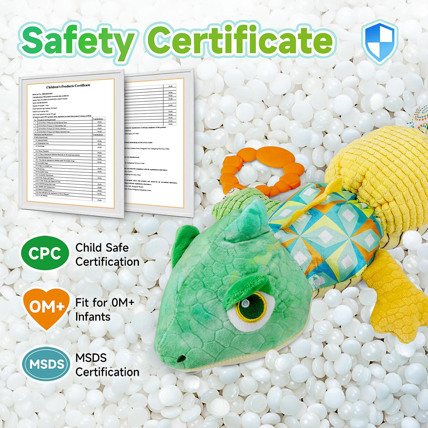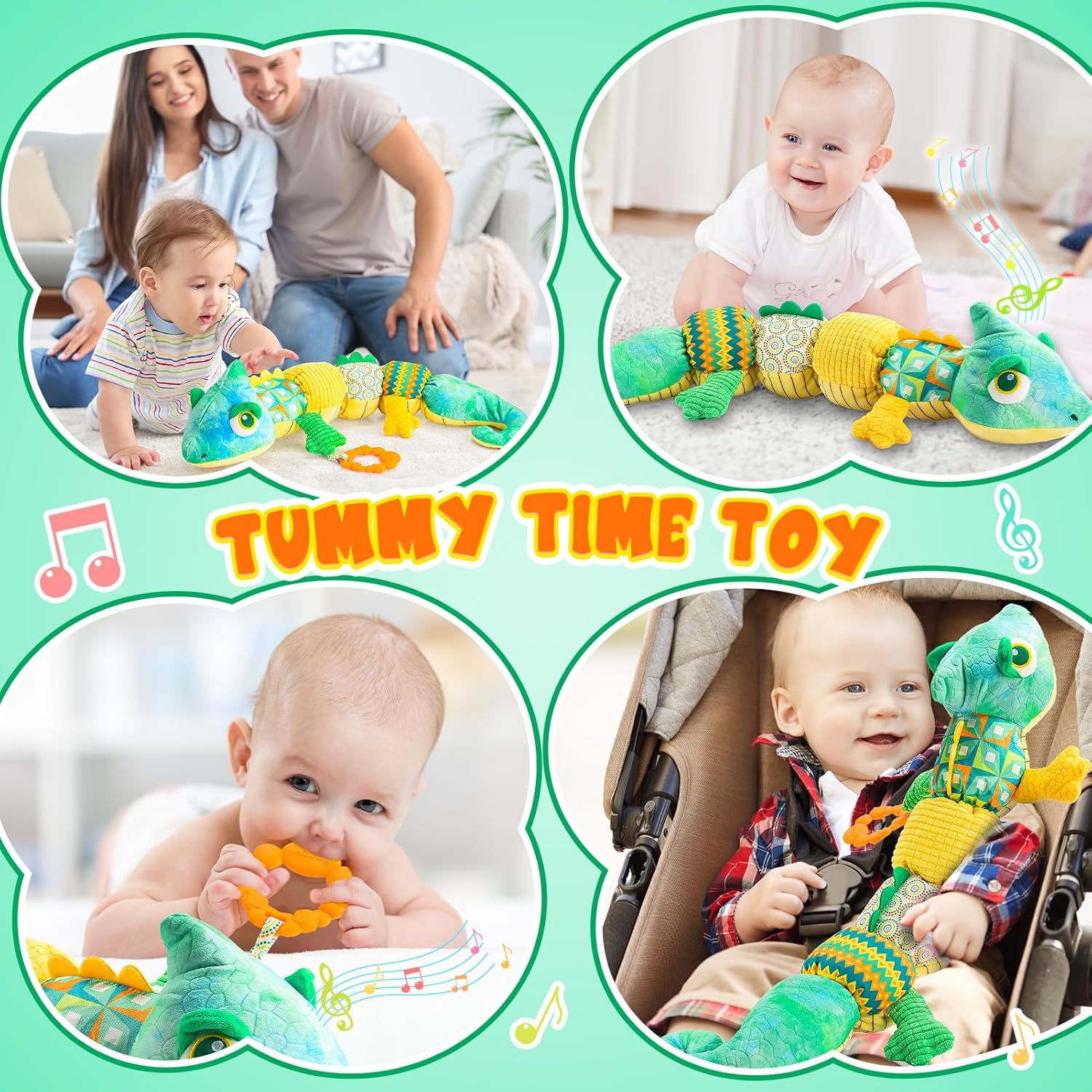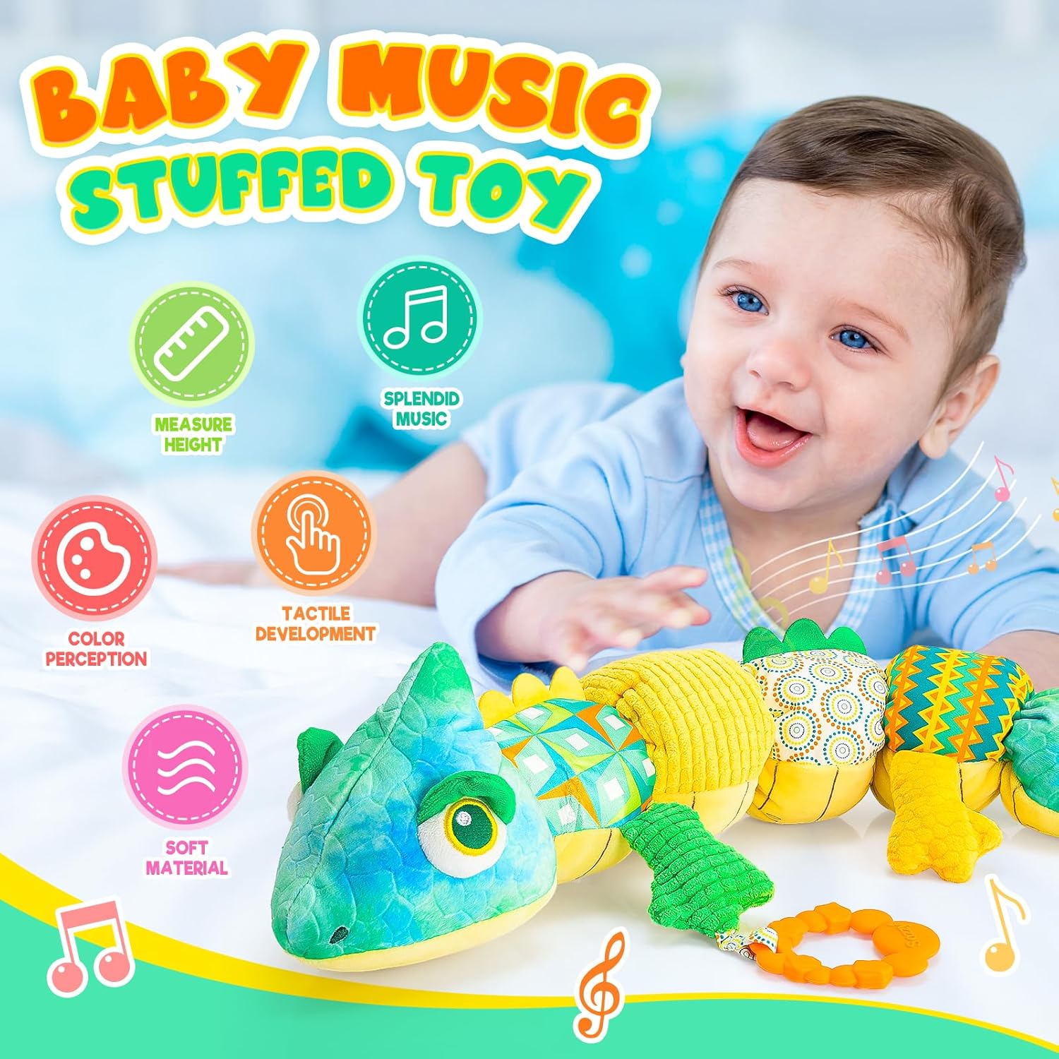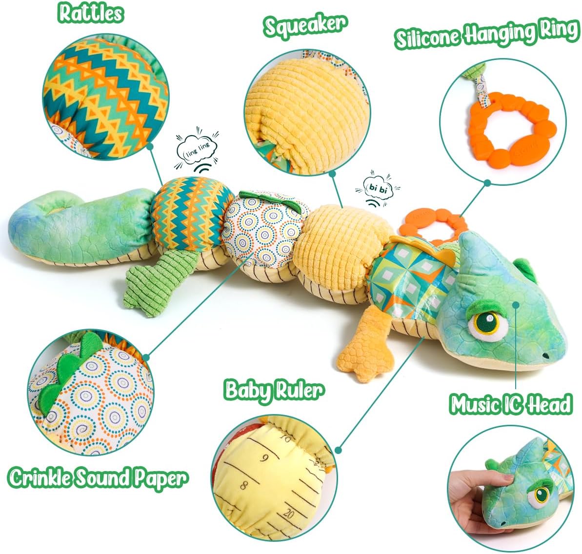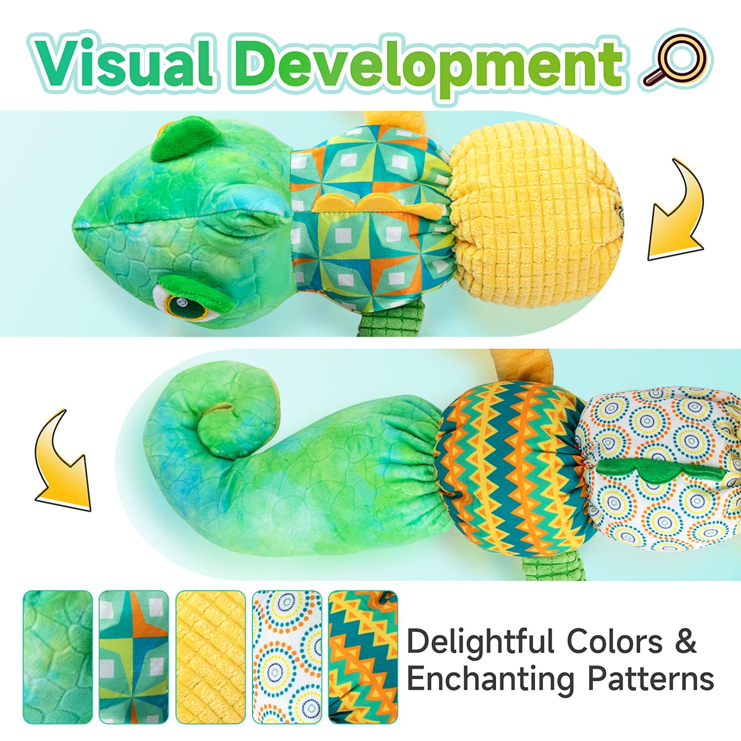 Această jucărie de pluș multifuncțională în formă de cameleon este special concepută pentru bebeluși încă de la naștere, oferind o varietate de activități senzoriale și educative care stimulează dezvoltarea timpurie.