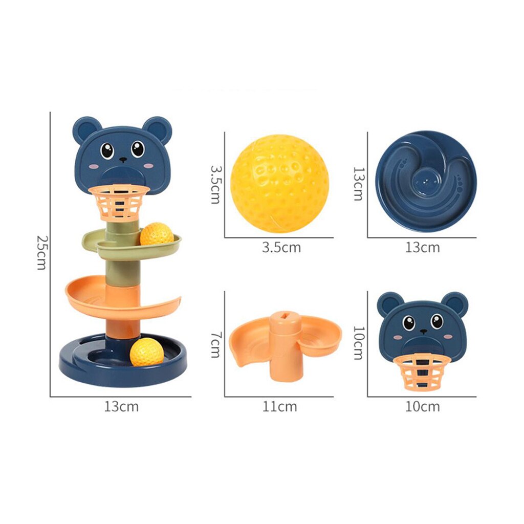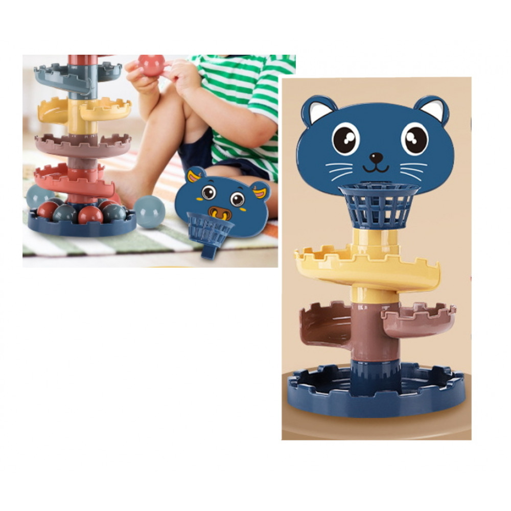 – este compusa din 3 discuri ce se aseaza unul peste celalalt, formand un turn. In capatul acestuia exista un cosulet prin care bilele sunt introduse in turn. Bilele se vor rostogoli si vor iesi din turn prin cele 3 orificii de la baza acestuia. Discurile sunt colorate diferit pentru a ajuta la invatarea culorilor.