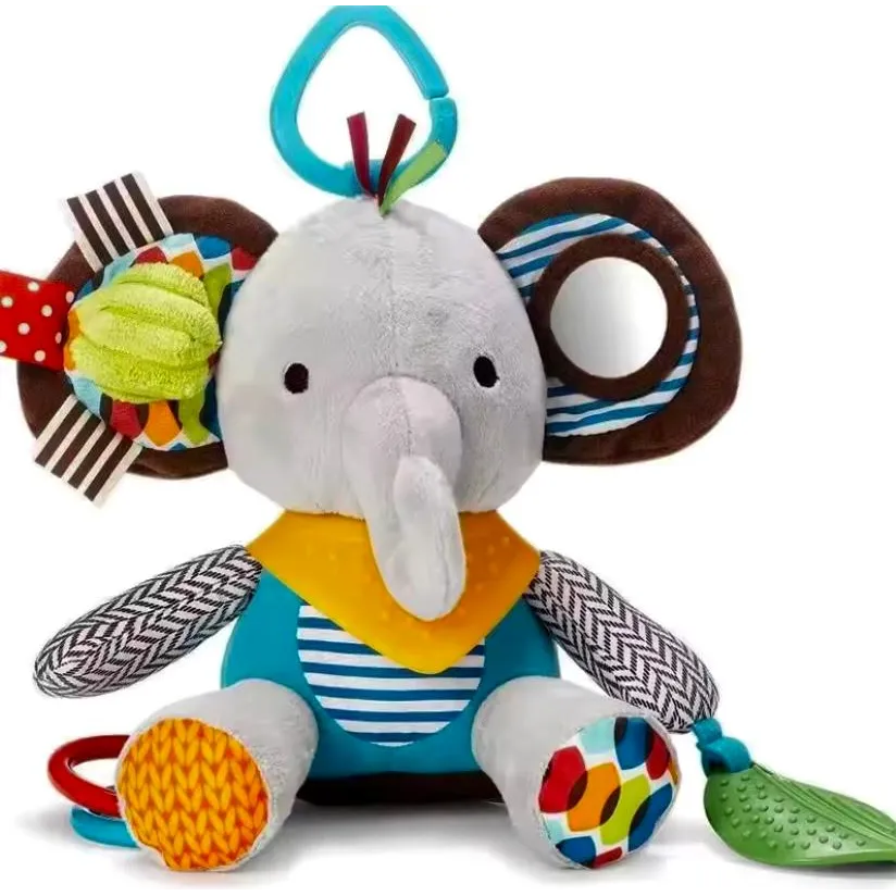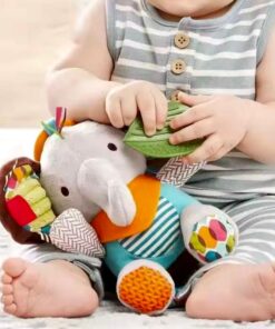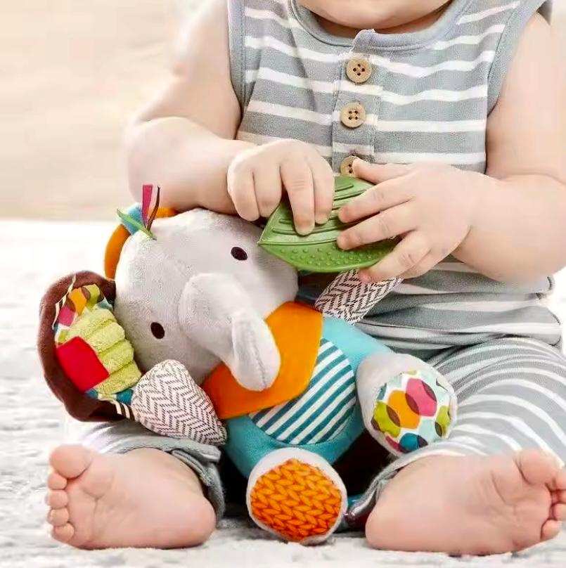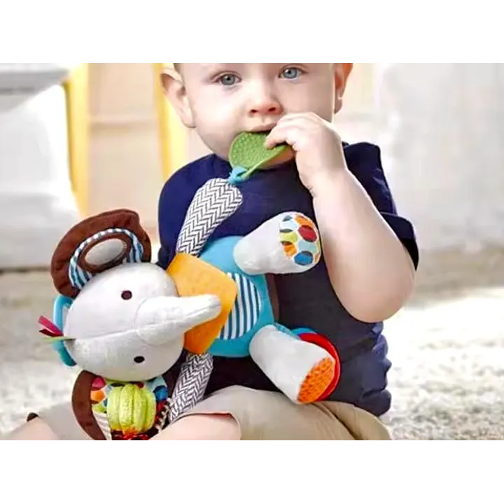Această jucărie senzorială în formă de elefant este concepută pentru a sprijini dezvoltarea timpurie a bebelușilor, oferind multiple funcționalități: dentiție, zornăitoare, materiale fosnitoare și texturi diverse. Este partenerul ideal pentru calmarea gingiilor și stimularea simțurilor tactile și auditive.