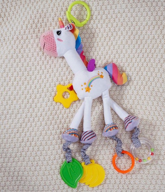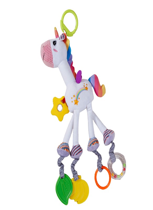 O jucărie moale și interactivă, special concepută pentru a stimula dezvoltarea senzorială a bebelușilor. Unicornul colorat este echipat cu multiple elemente care încurajează explorarea, motricitatea fină și dezvoltarea coordonării ochi-mână.
