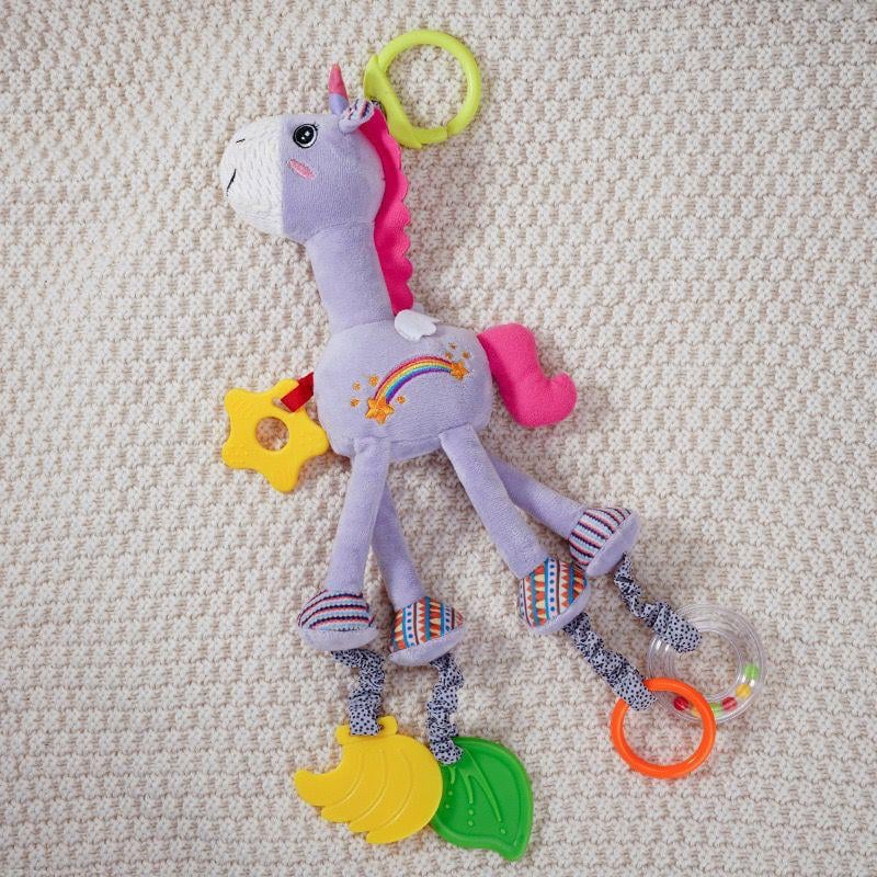 O jucărie moale și interactivă, special concepută pentru a stimula dezvoltarea senzorială a bebelușilor. Unicornul colorat este echipat cu multiple elemente care încurajează explorarea, motricitatea fină și dezvoltarea coordonării ochi-mână.