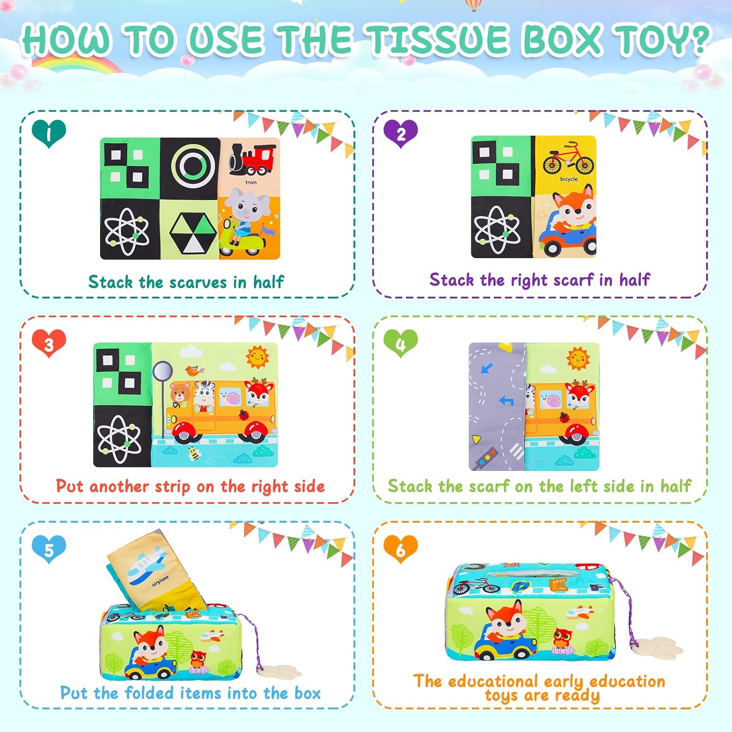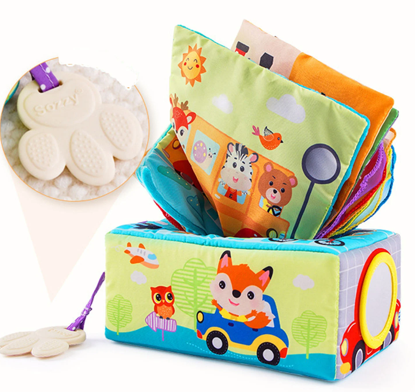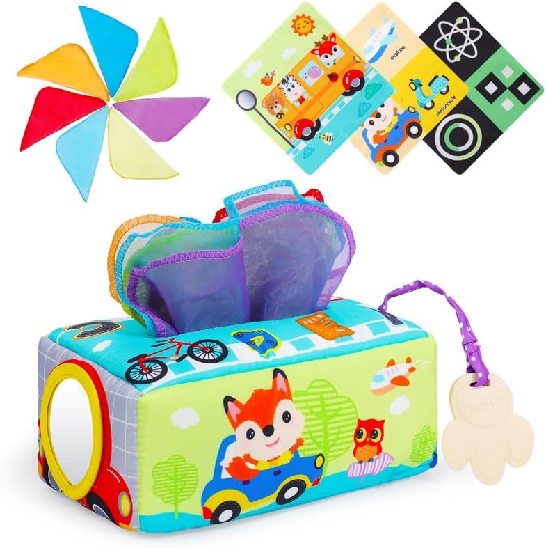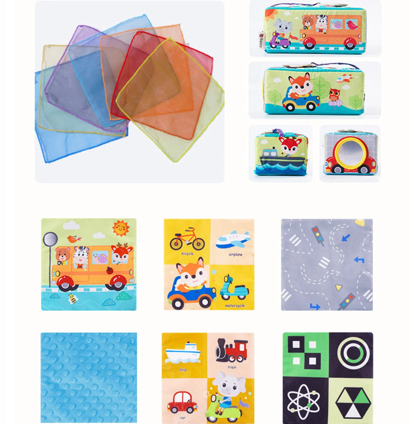 Această jucărie senzorială, cunoscută sub numele de „Cutia cu batiste”, este special concepută pentru bebelușii cu vârsta de la 0 luni în sus. Jucăria oferă o experiență multisenzorială prin intermediul materialelor moi, culorilor vii și texturilor variate, stimulând simțurile copilului.