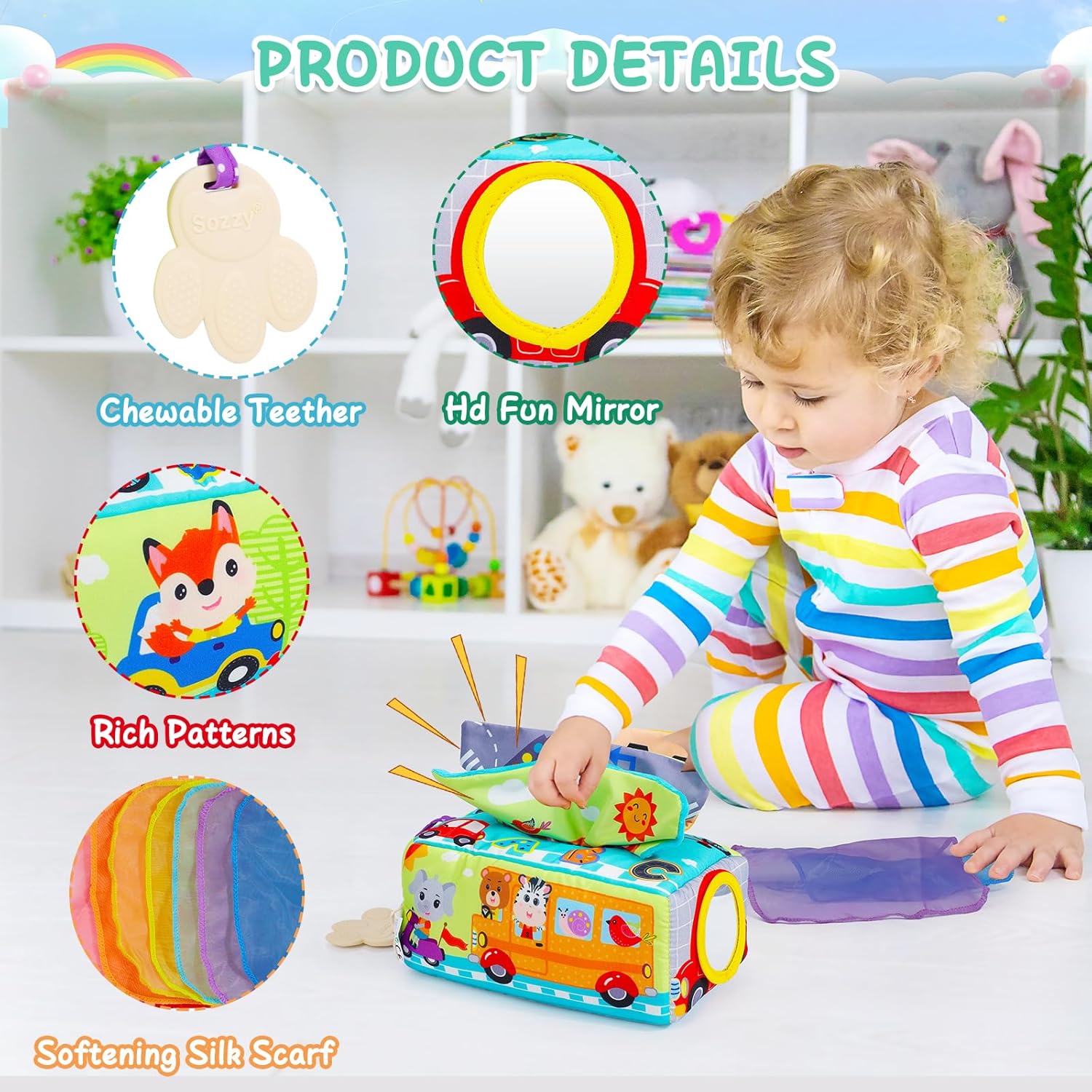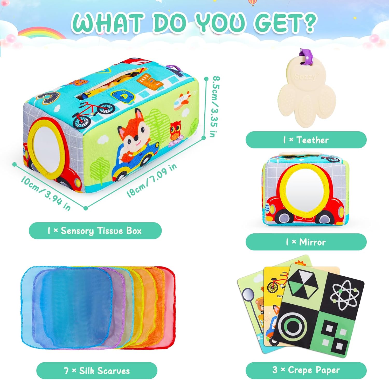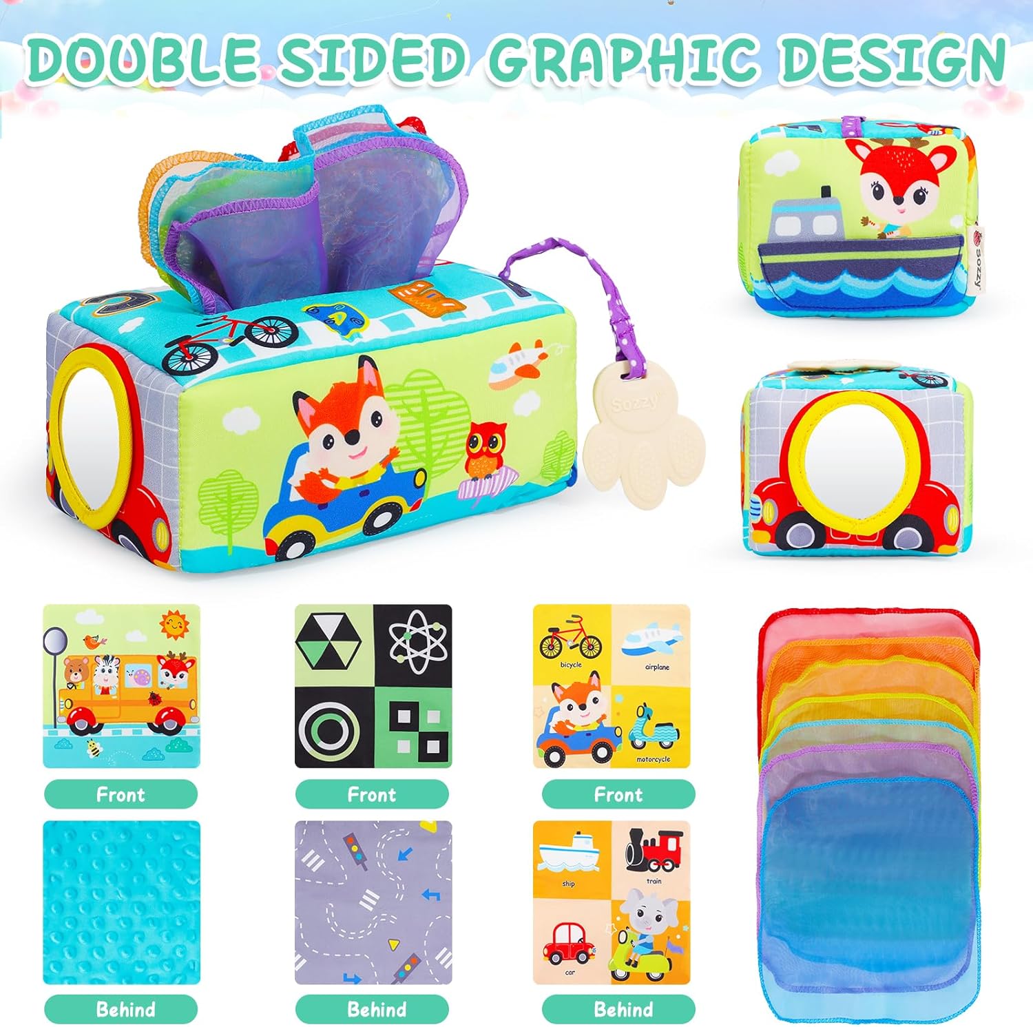 Această jucărie senzorială, cunoscută sub numele de „Cutia cu batiste”, este special concepută pentru bebelușii cu vârsta de la 0 luni în sus. Jucăria oferă o experiență multisenzorială prin intermediul materialelor moi, culorilor vii și texturilor variate, stimulând simțurile copilului.
