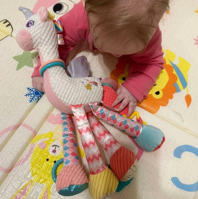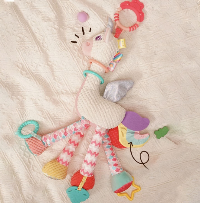 Această jucărie senzorială sub formă de unicorn roz este concepută special pentru a stimula dezvoltarea senzorială a bebelușilor de la naștere. Este realizată din materiale sigure și moi, ideale pentru a calma durerile cauzate de apariția dinților.