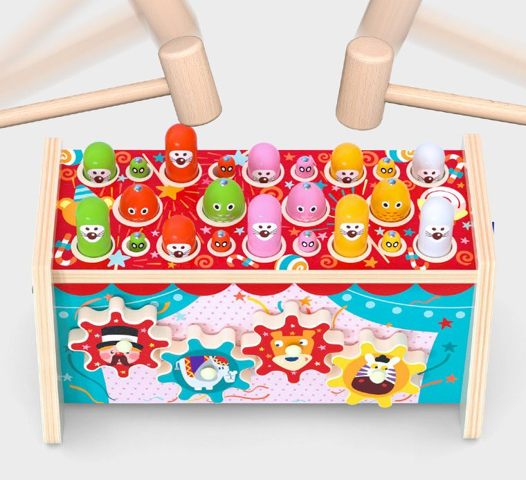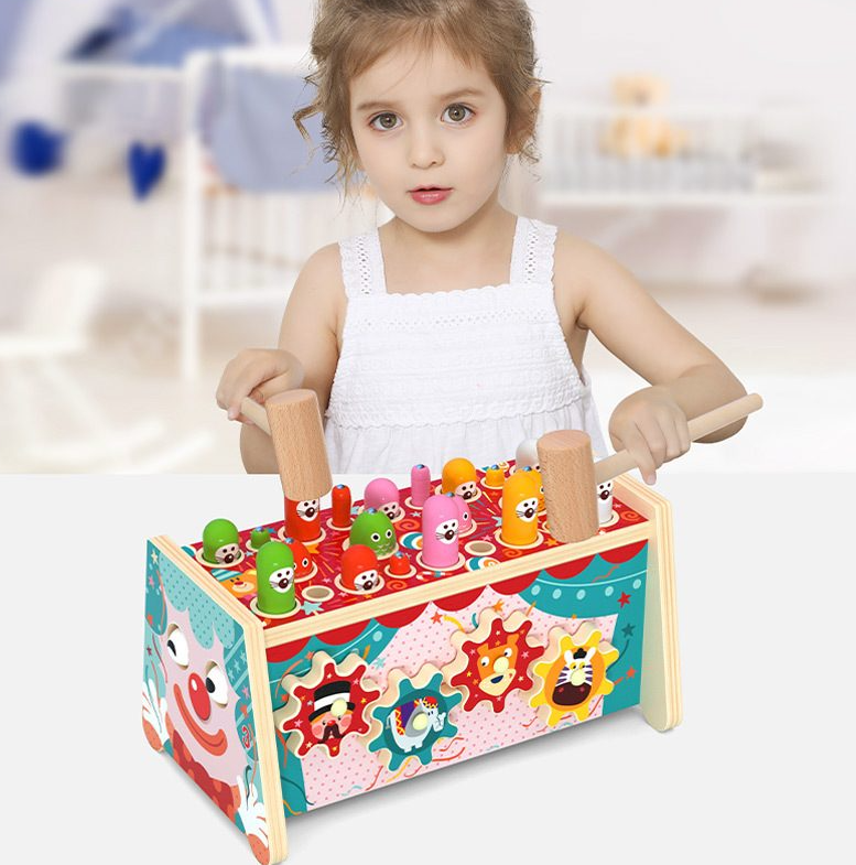 - Lovirea cu ciocanul: Copiii pot folosi ciocanelele din lemn pentru a lovi piesele colorate care se mișcă în sus și în jos. Această activitate ajută la dezvoltarea coordonării mână-ochi și a forței musculare.
