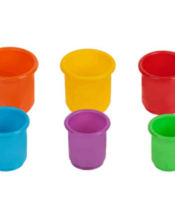 Setul include 6 pahare din plastic, cu diametre diferite, pentru stivuire.