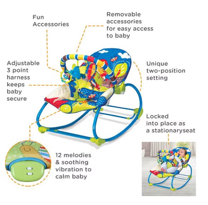 - Funcție 2 în 1: Se transformă din balansoar într-un scăunel static, ideal pentru utilizare pe termen lung.
