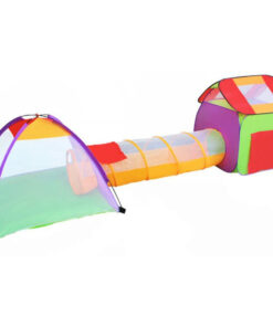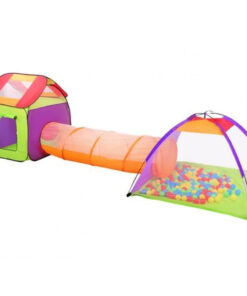 Cort pentru copii – 2 corturi cu tunel. Setul include un cort patrat cu acoperis, un cort cu cadru si un tunel care leaga (posibilitatea de a folosi corturile separat, fara tunel si orice configuratie, datorita mai multor iesiri din cort).