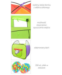Setul include bile colorate, închise ermetic. Un set perfect pentru a te juca atât acasă, cât și în grădină. Cortul se desface singur, iar datorita pungii atasate cu manere, transportul si depozitarea cortului pliat va fi extrem de usor! Fabricat din material sintetic.