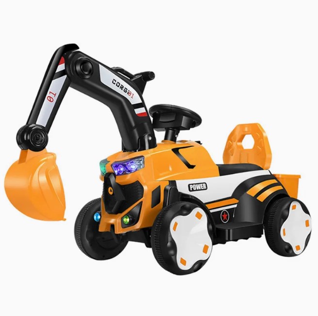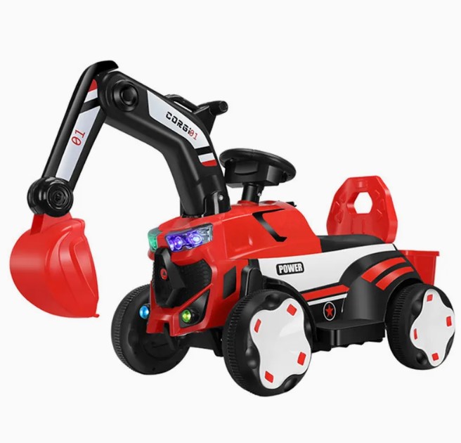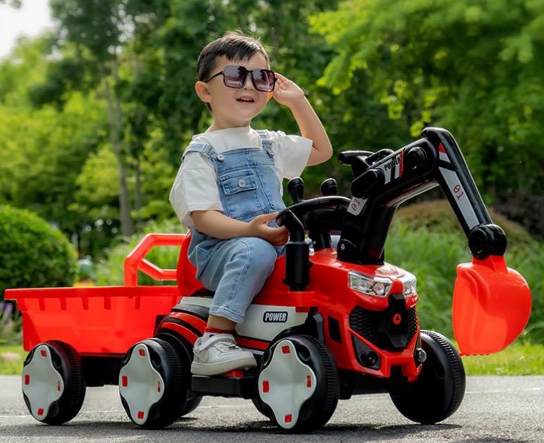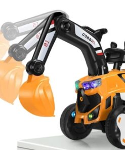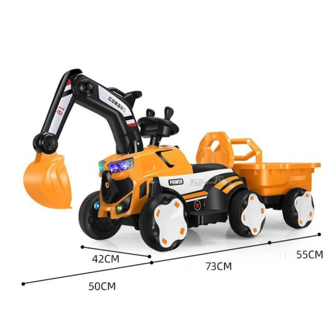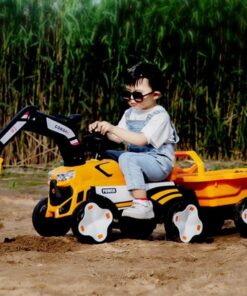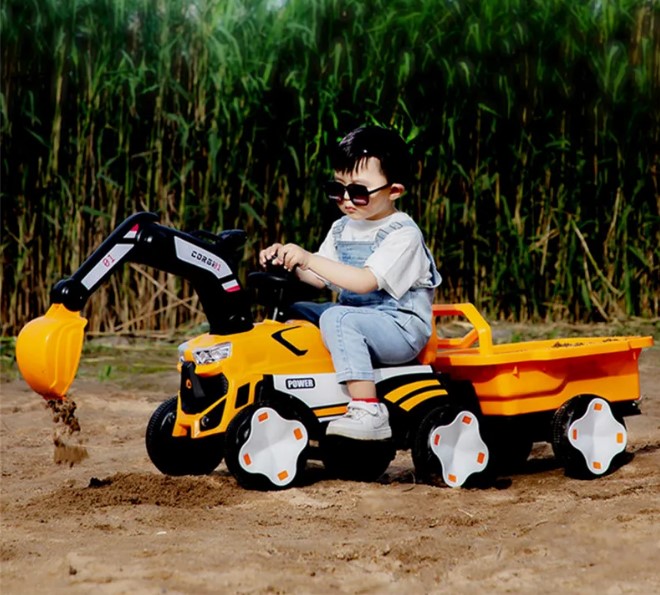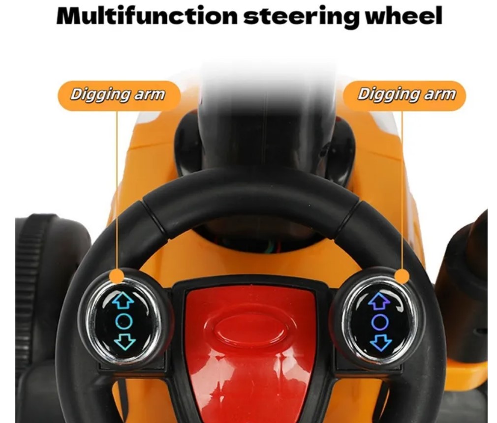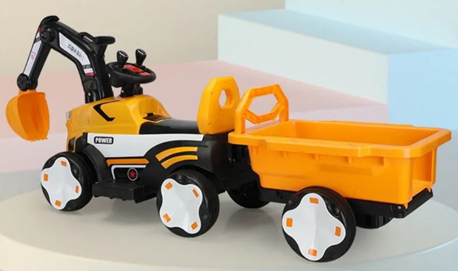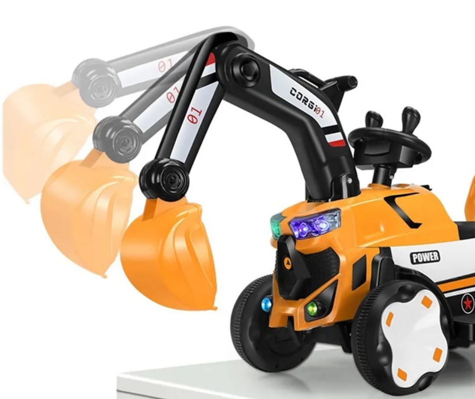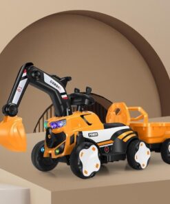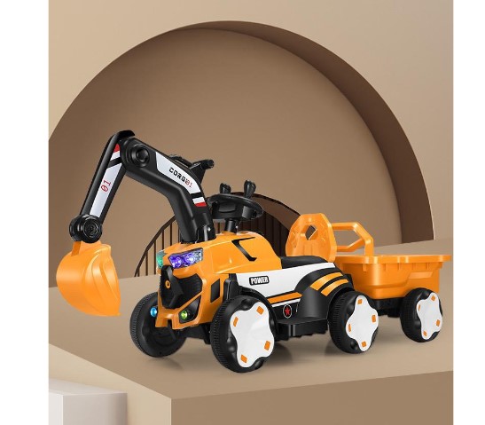 Mașinuță electrică tip excavator pentru copii, echipată cu braț de excavare funcțional, remorcă detașabilă și sistem de iluminare LED. Concepută pentru dezvoltarea coordonării și jocului de rol, este ideală pentru copii cu vârste între 2 și 8 ani.