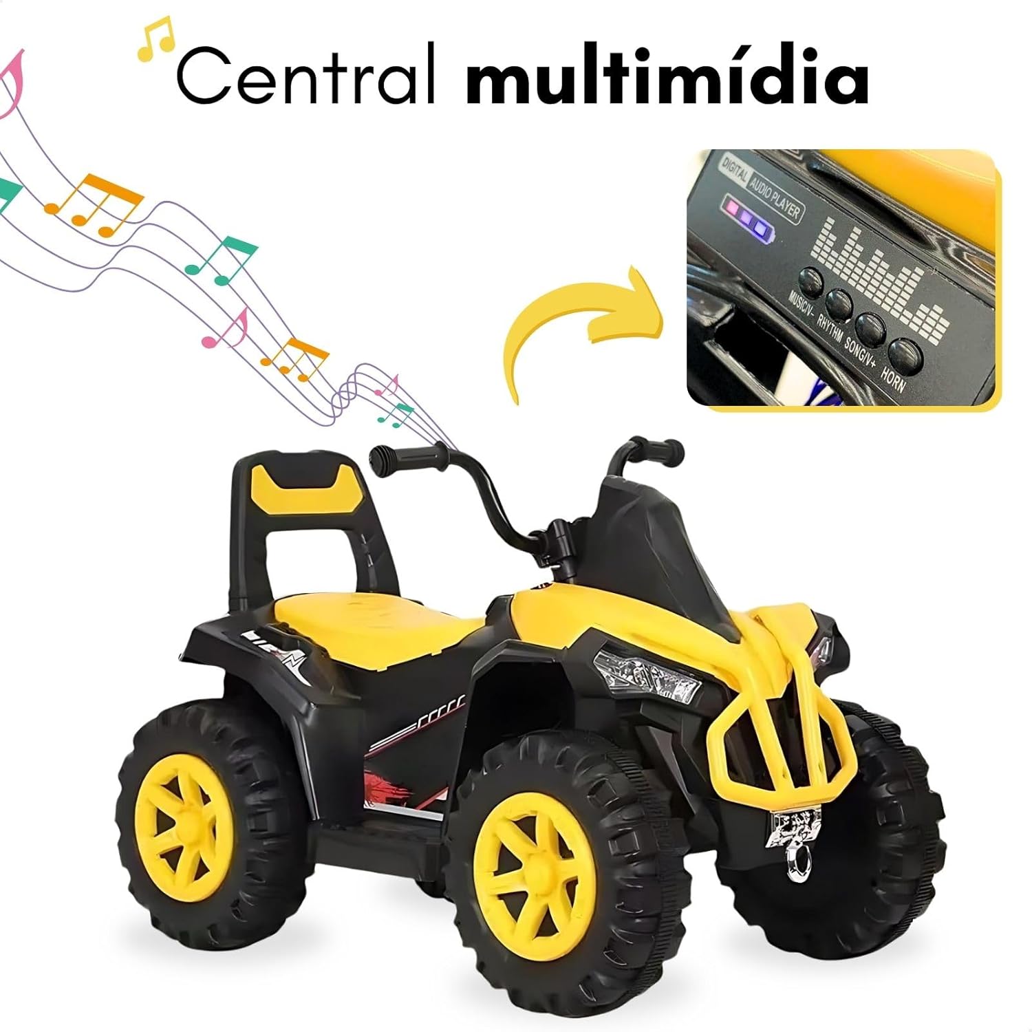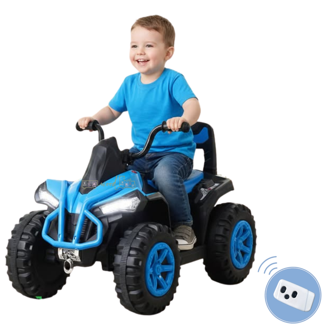 ATV electric pentru copii, echipat cu baterie reîncărcabilă 6V, telecomandă pentru control parental, funcții multimedia (Bluetooth, USB, MP3) și faruri LED. Ideal pentru copii între 2 și 7 ani, pentru joacă în siguranță și dezvoltarea coordonării.