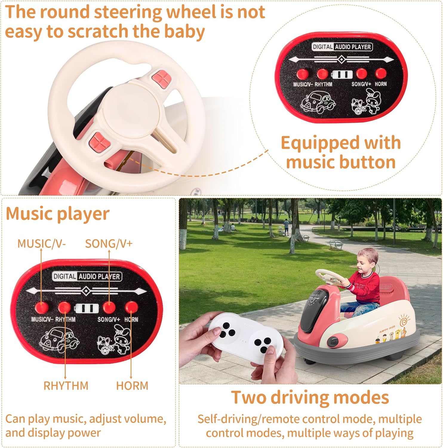 Copilul poate conduce mașinuța tip bumper folosind volanul, experimentând senzația de condus. Părinții pot controla mașinuța prin telecomandă, pentru a asigura siguranța copilului.
