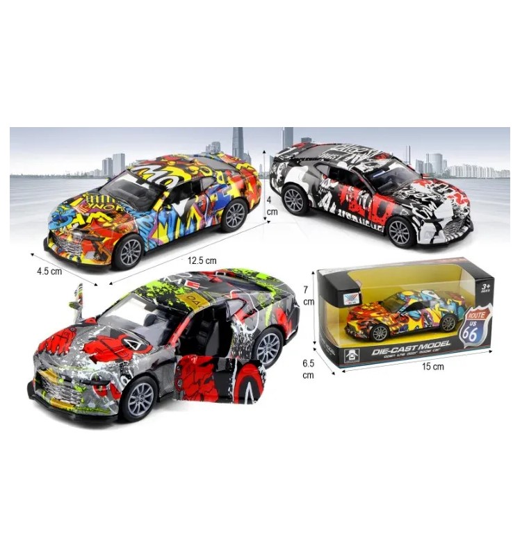 Această mașinuță metalică, cu un design graffiti atrăgător, este perfectă pentru micii pasionați de vehicule! Realizată din metal de calitate și detalii din plastic rezistent, oferă durabilitate și un aspect realist. Ușile se pot deschide, adăugând un plus de interactivitate și realism în joc.