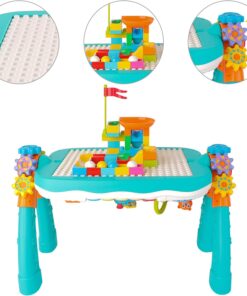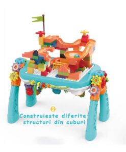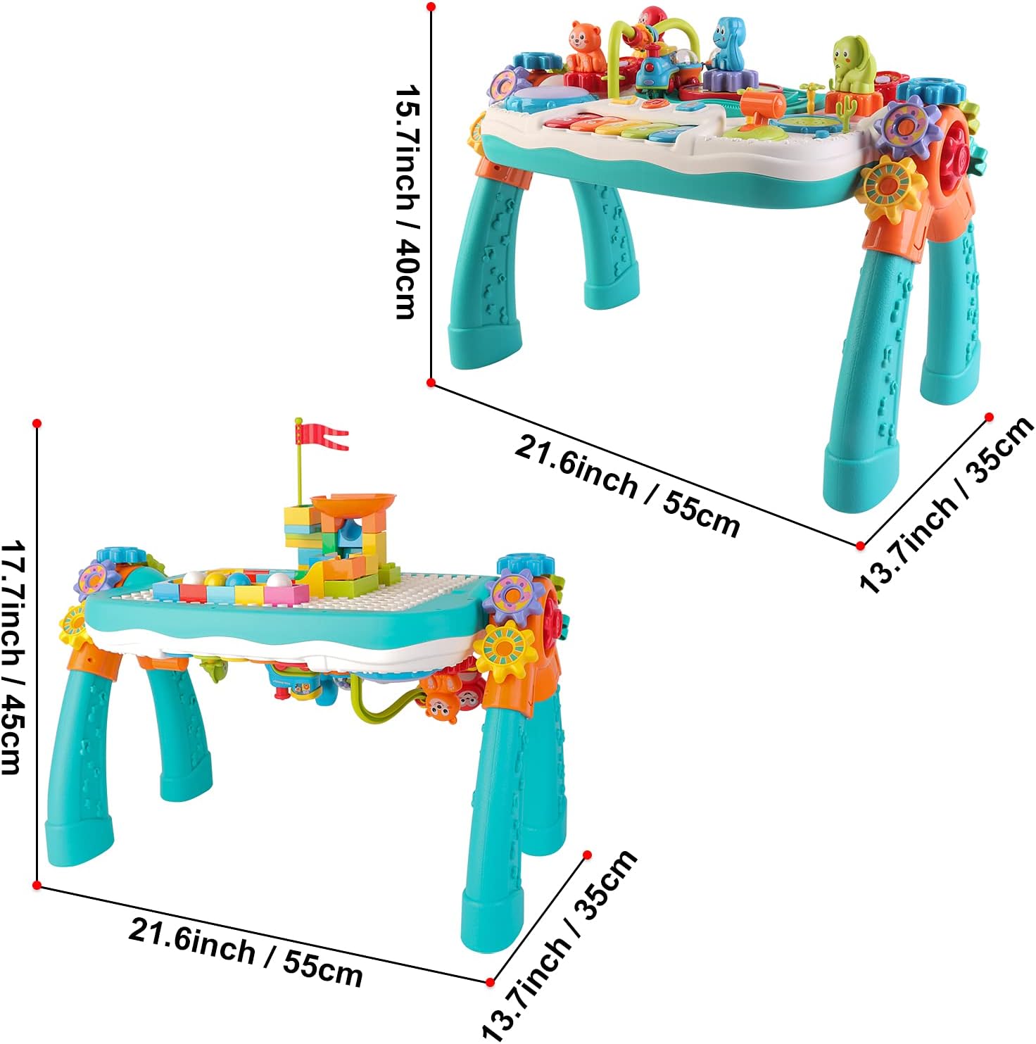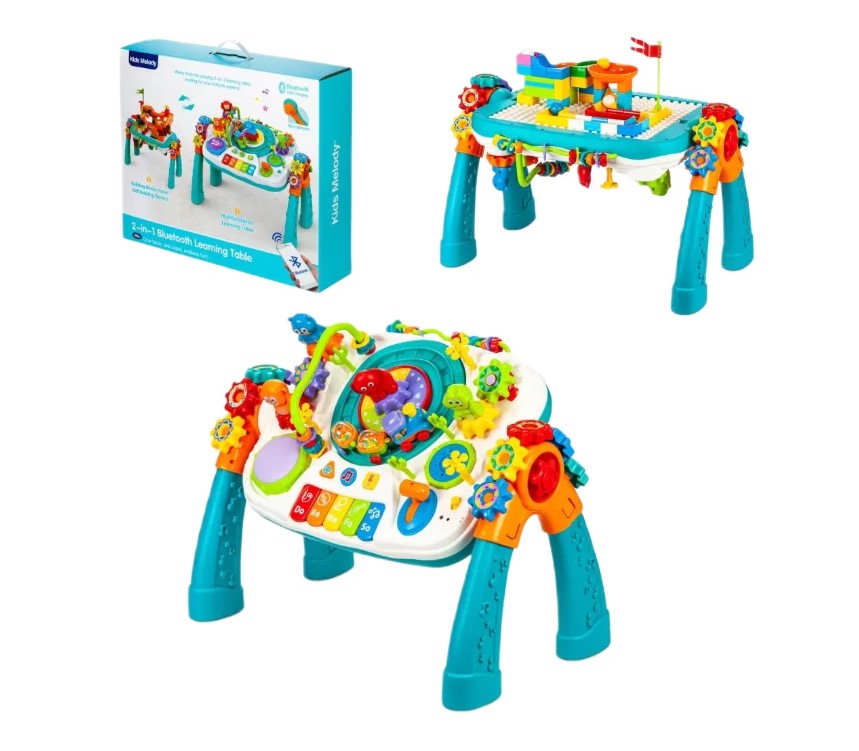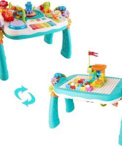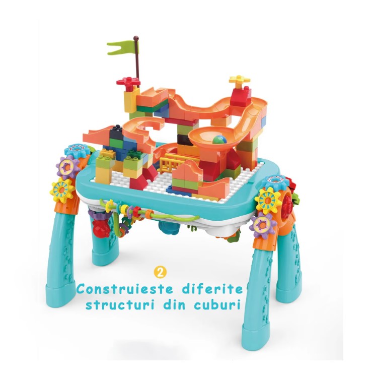 Această măsuță multifuncțională este un adevărat centru de învățare prin joc. Designul modular 2 în 1 le oferă copiilor o experiență completă: partea superioară se poate transforma dintr-un centru interactiv muzical și motric într-o platformă de construcție cu cuburi, dezvoltând astfel: